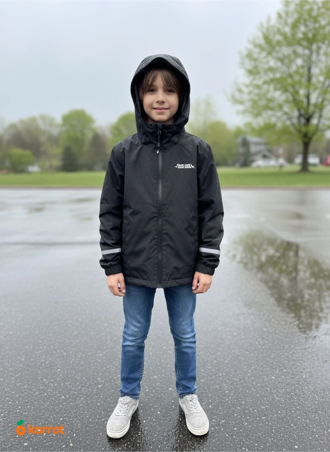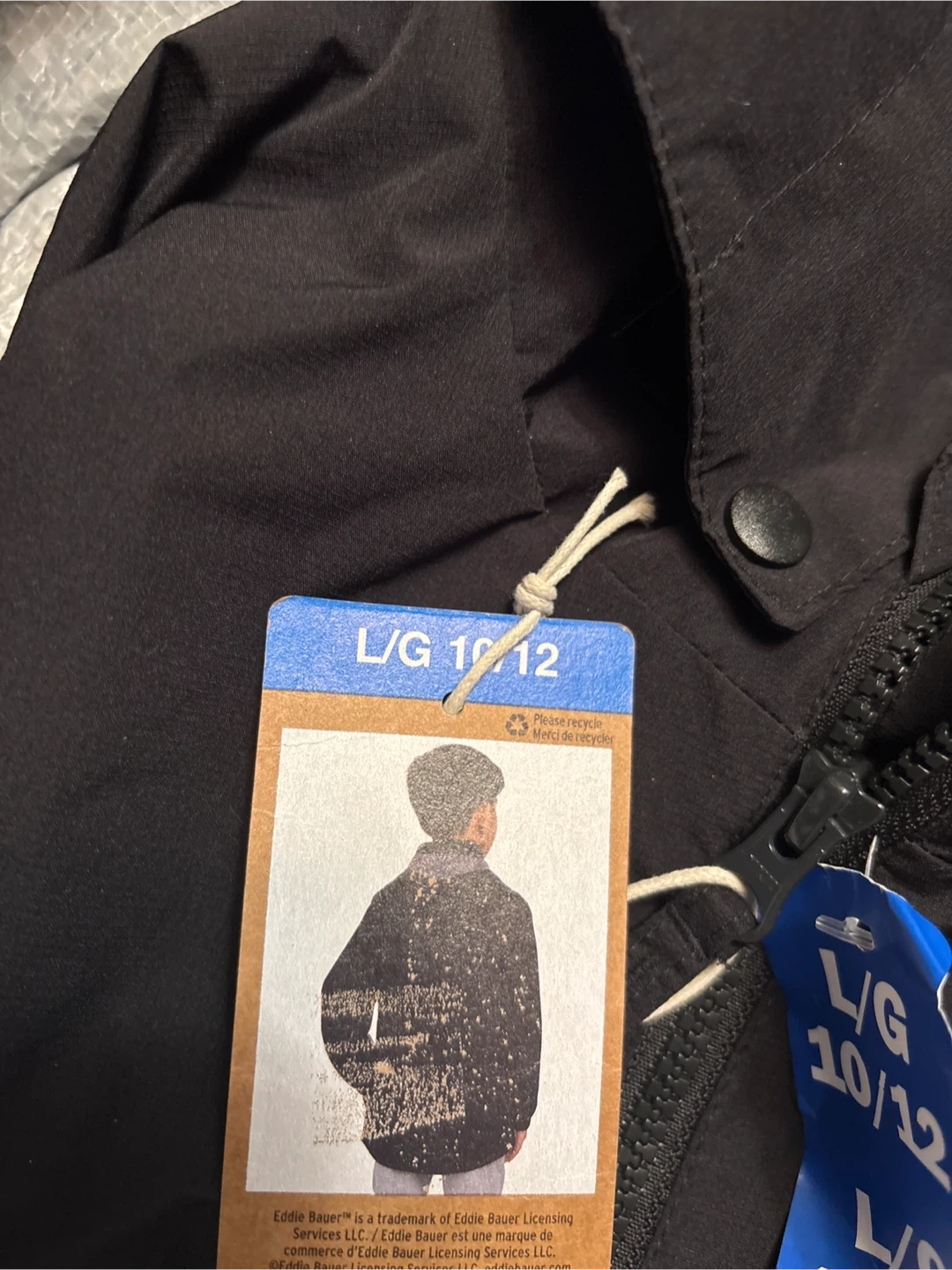 Eddie Bauer youth spring jacket in black. It's a size L/G 10/12. Water-resistant material. It's great for keeping kids dry on damp spring days!