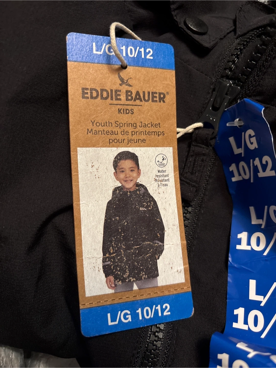 Eddie Bauer youth spring jacket in black. It's a size L/G 10/12. Water-resistant material. It's great for keeping kids dry on damp spring days!