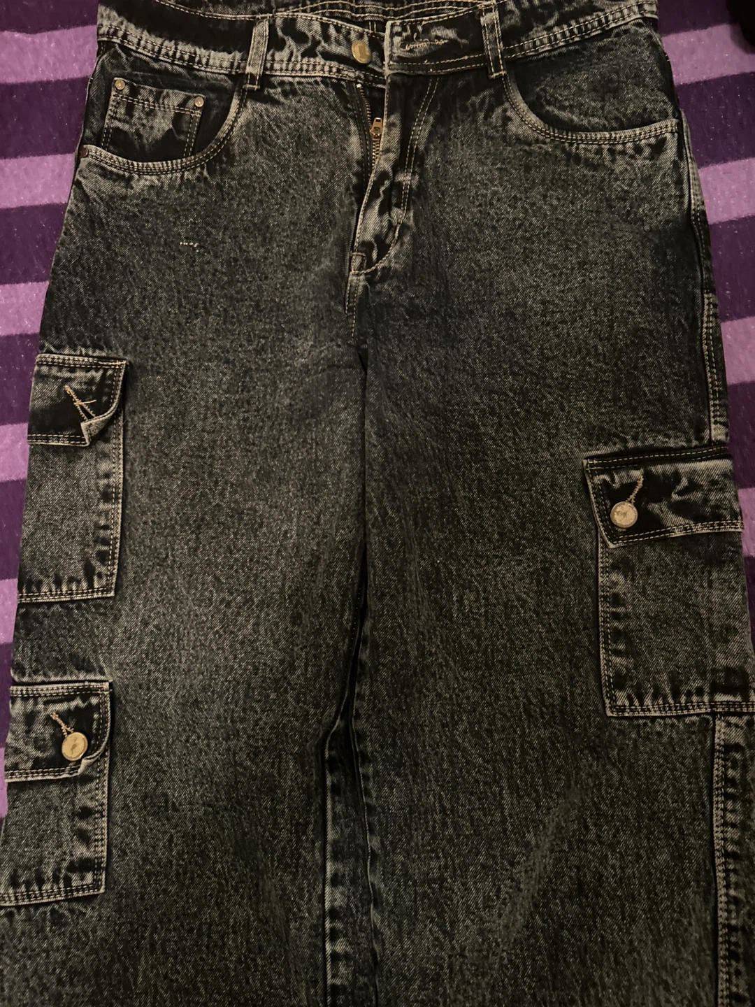 These cargo denim jeans have a washed black finish. They feature multiple pockets with button closures for extra storage. Made from durable denim material.