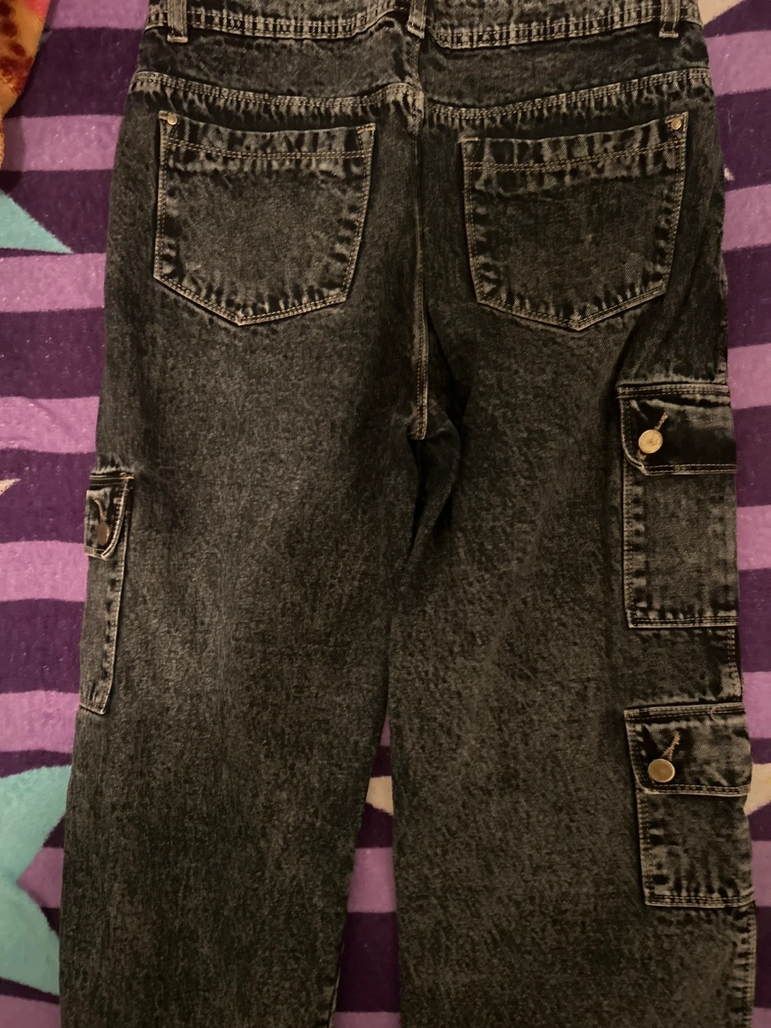 These cargo denim jeans have a washed black finish. They feature multiple pockets with button closures for extra storage. Made from durable denim material.