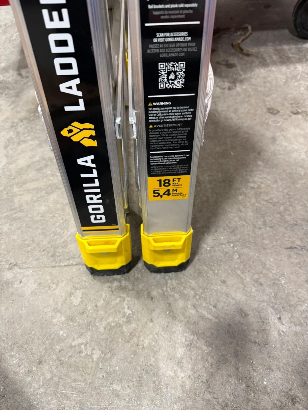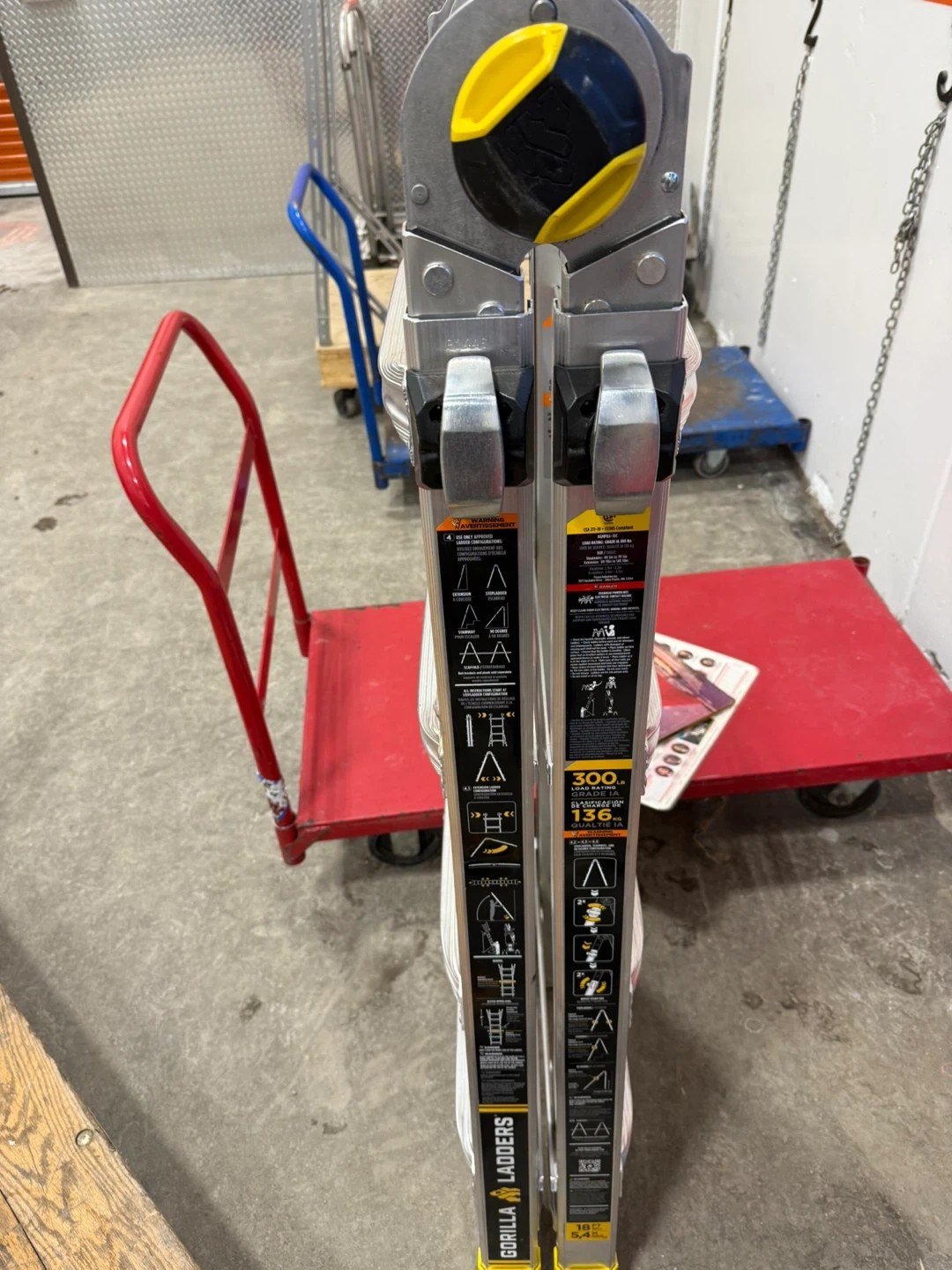 Gorilla Ladders multi-position ladder. It's 18 ft. and has a weight capacity of 300 lbs. Made of aluminum.