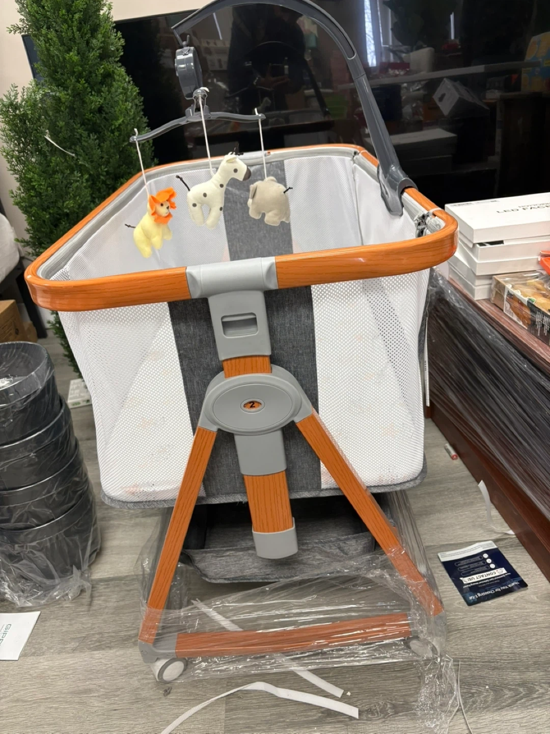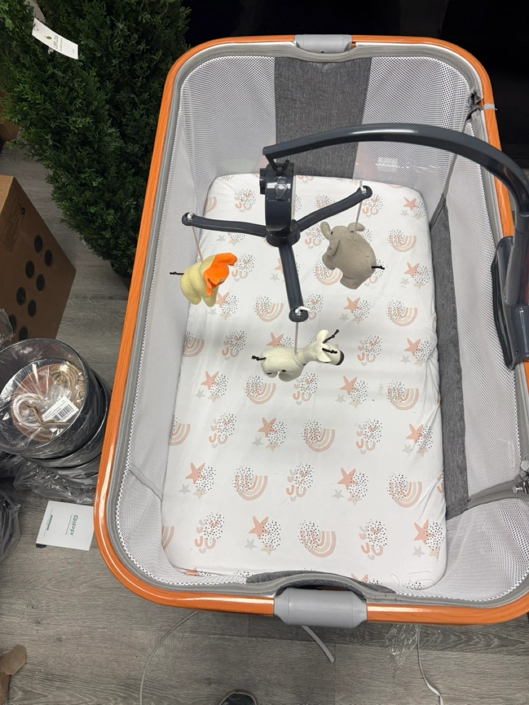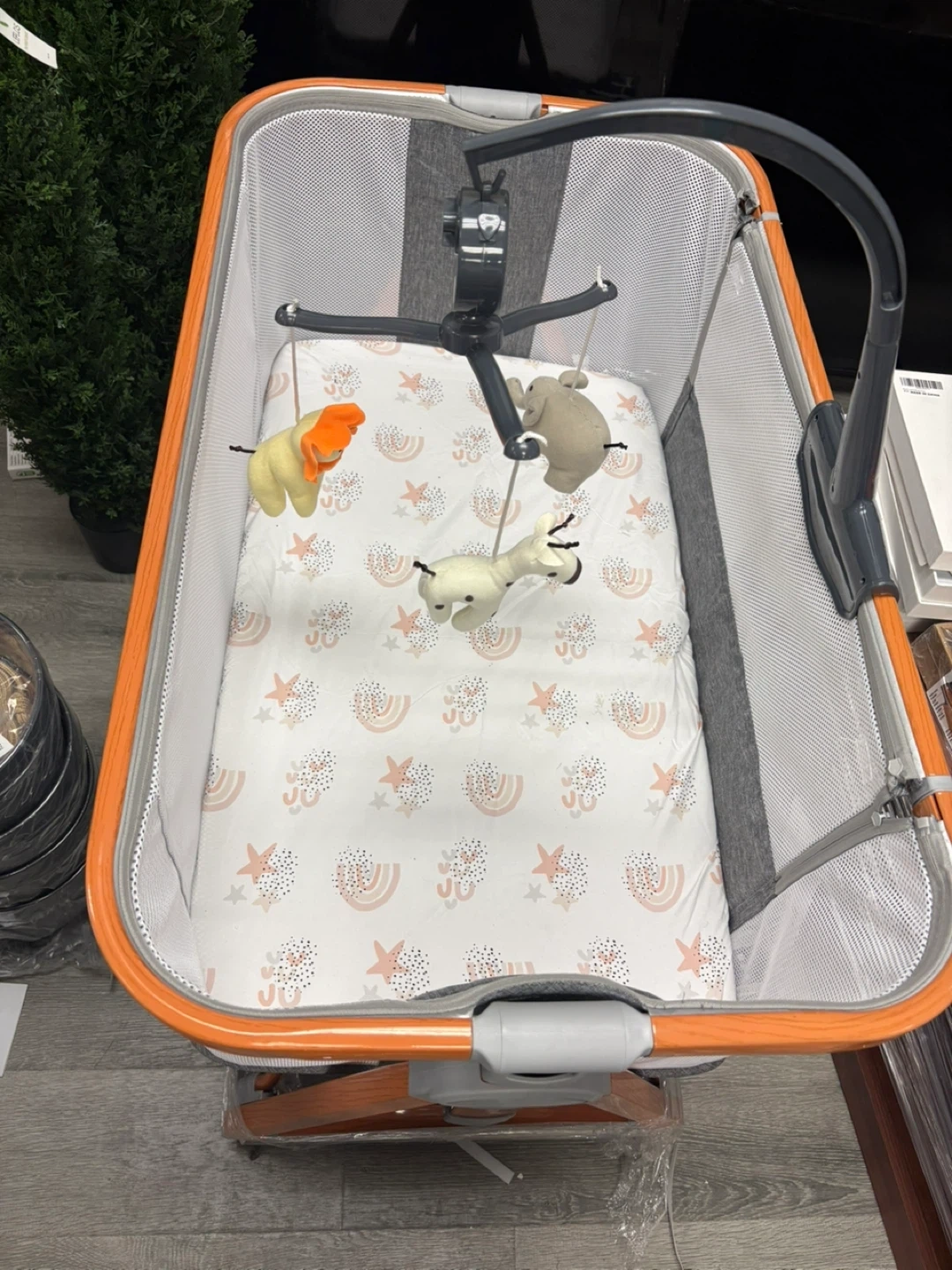 This baby bassinet comes with a cute mobile featuring animal toys. It has a patterned mattress and mesh sides. The frame is orange and wood-toned.