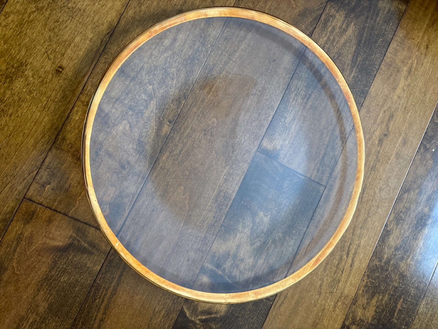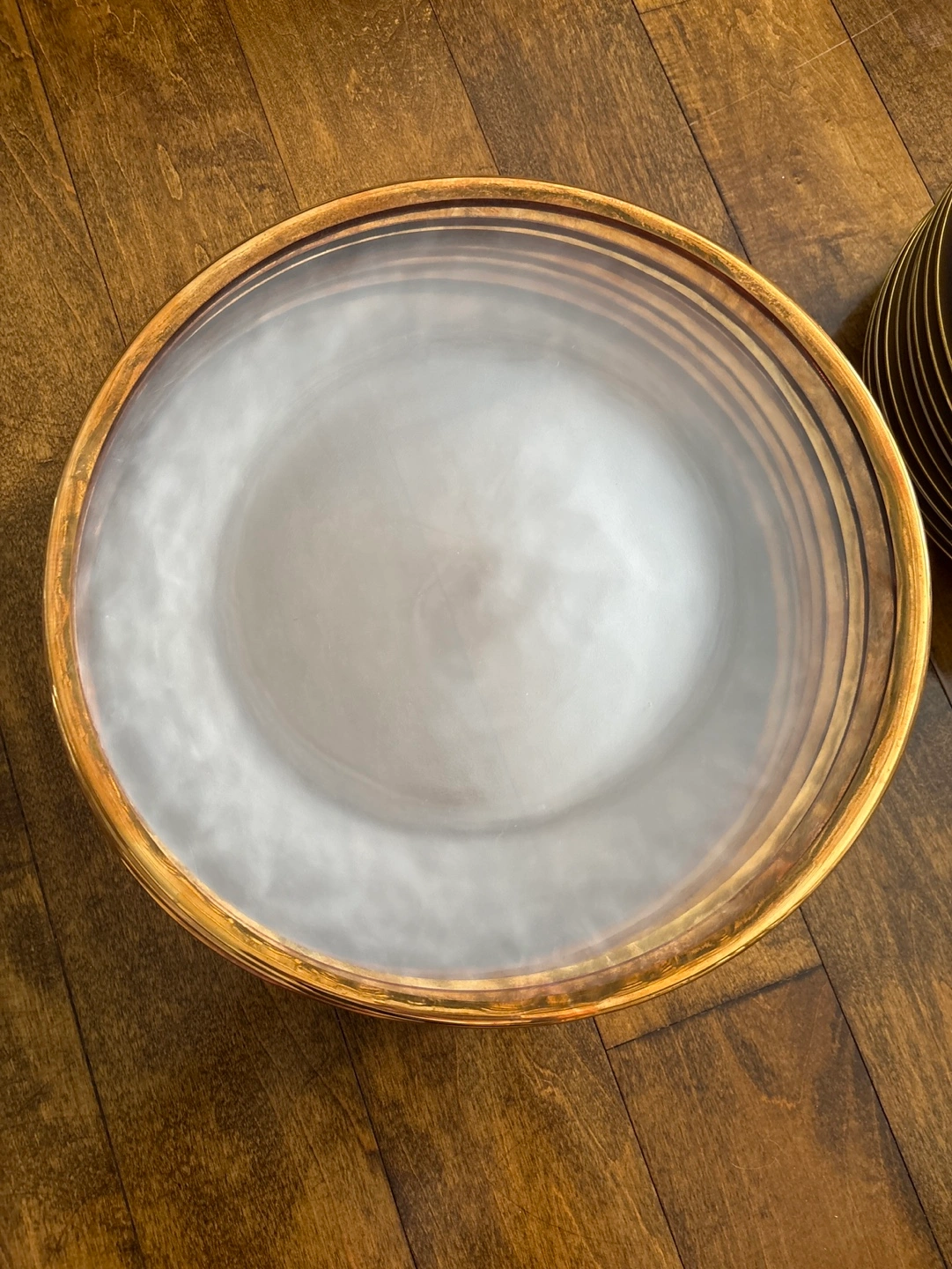 Beautiful set of glass chargers. Gold coloured rim. Perfect for special occasions. Elegant addition to your tableware.