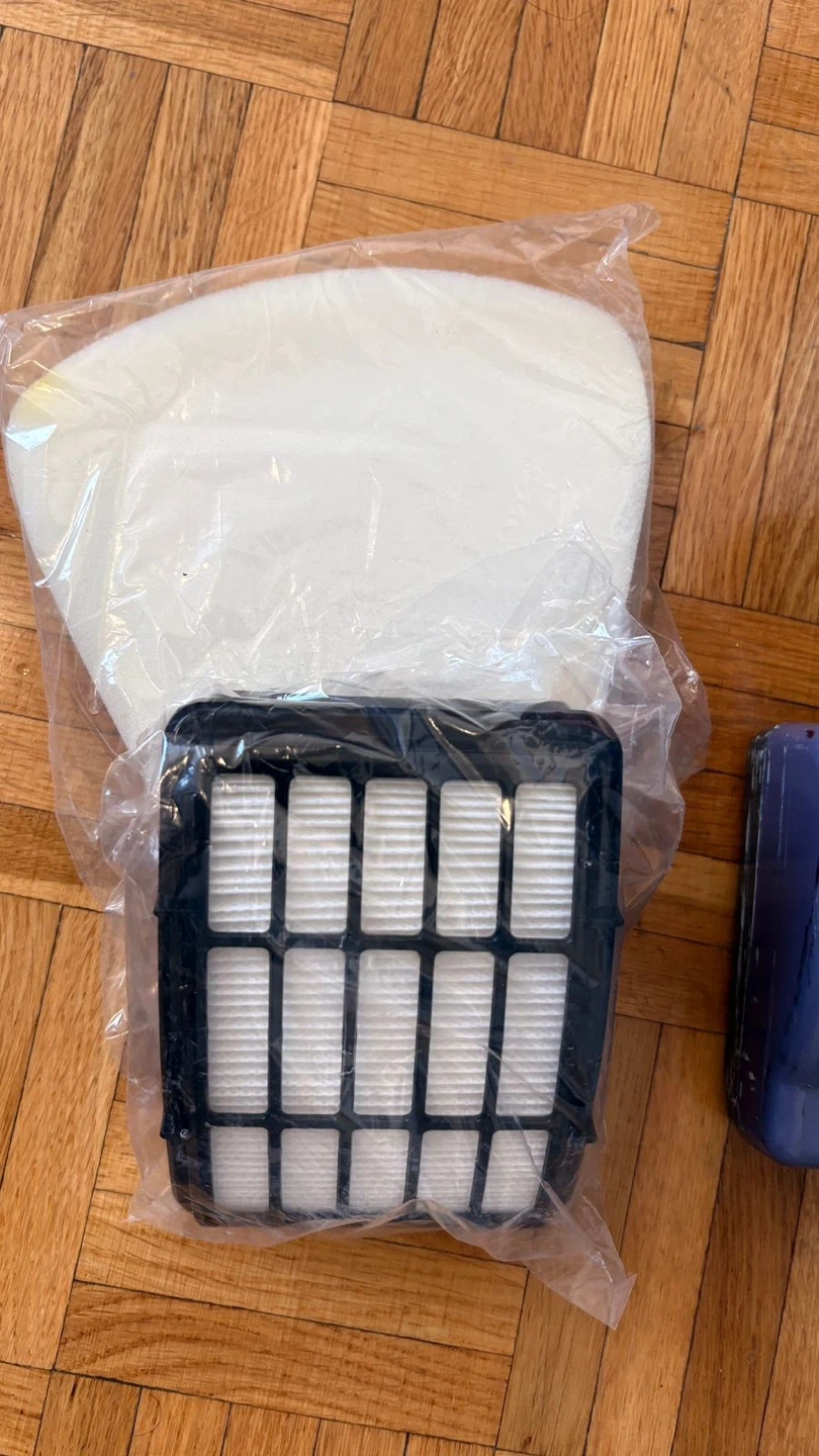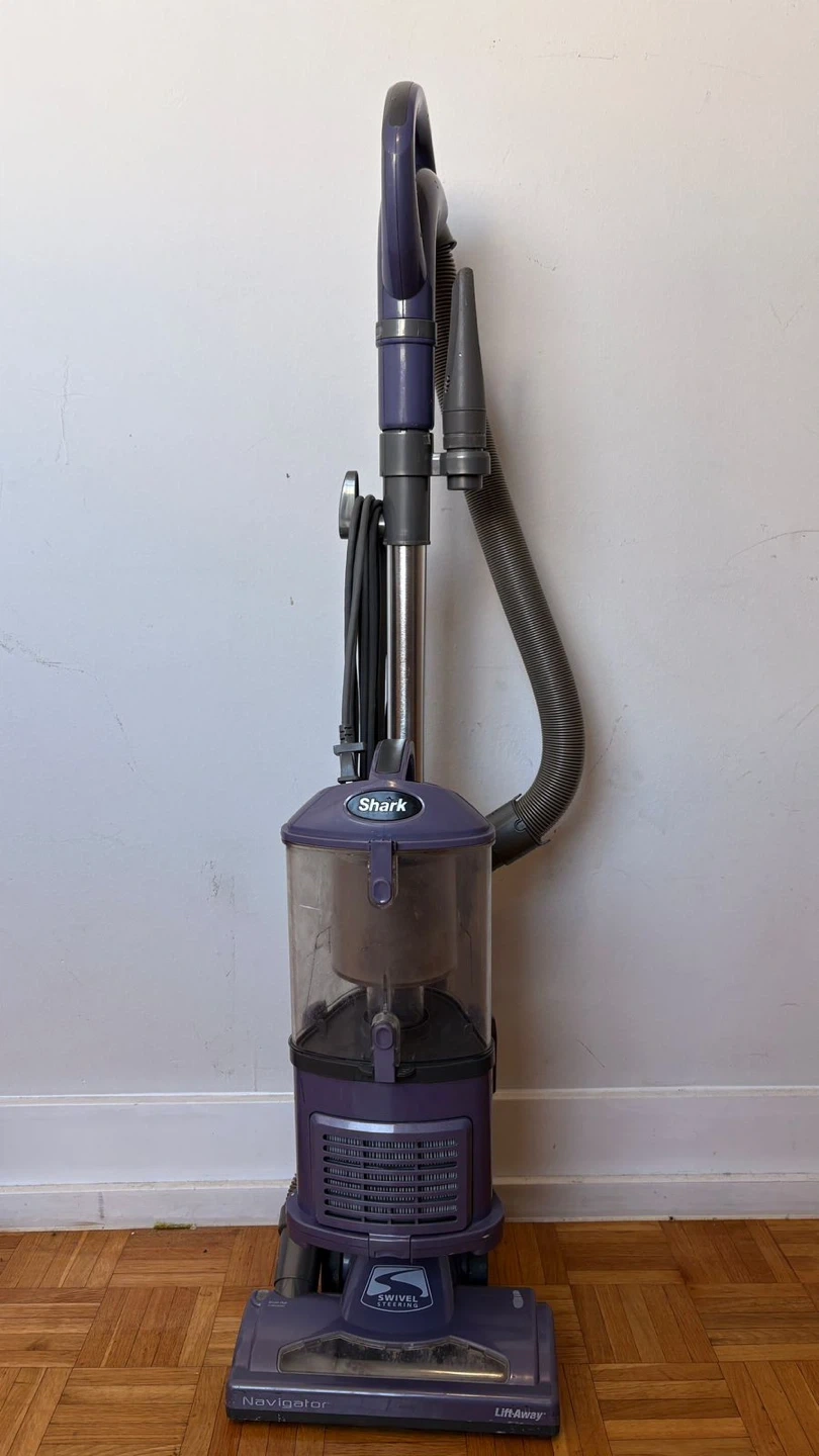 Shark Navigator Lift-Away vacuum cleaner, model NV352. Includes a foam filter and a secondary filter. It's purple and silver. This vacuum is designed for household use.
