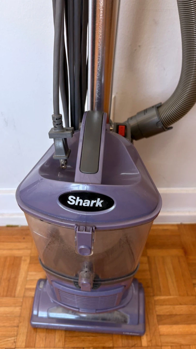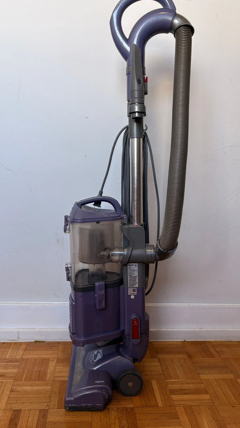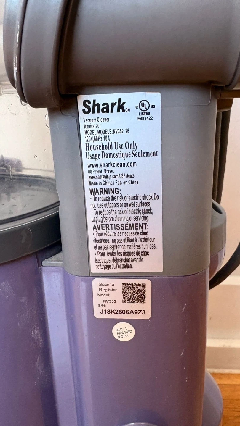 Shark Navigator Lift-Away vacuum cleaner, model NV352. Includes a foam filter and a secondary filter. It's purple and silver. This vacuum is designed for household use.