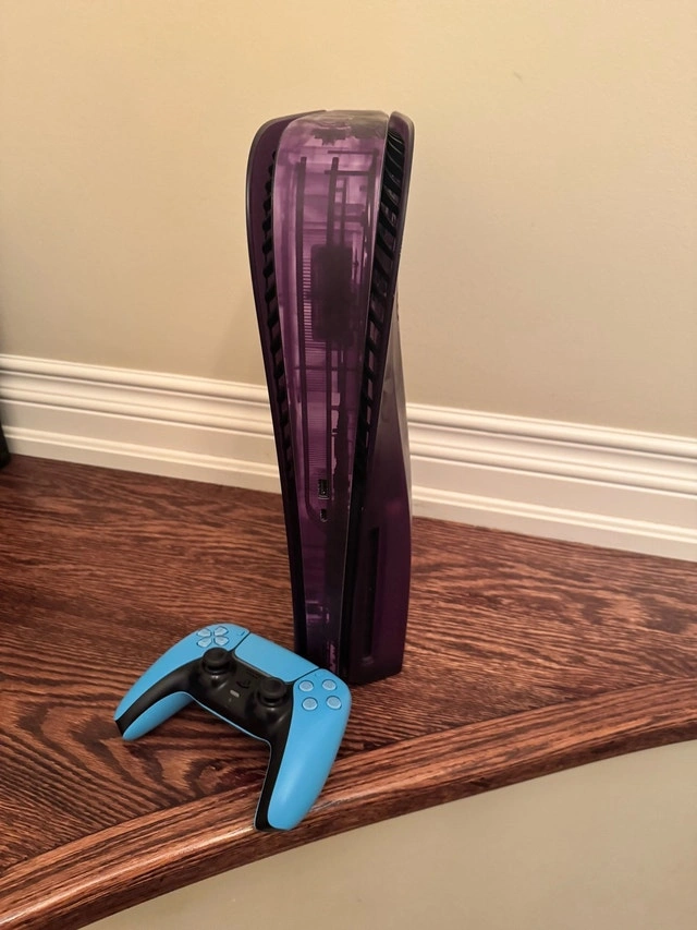 Selling a used PlayStation 5 disc edition with a custom purple shell and a blue controller. The console is in good condition and works perfectly. It's a real head-turner and will definitely add some flair to your gaming setup! This is a used console. * Custom purple shell * Blue controller * Disc edition