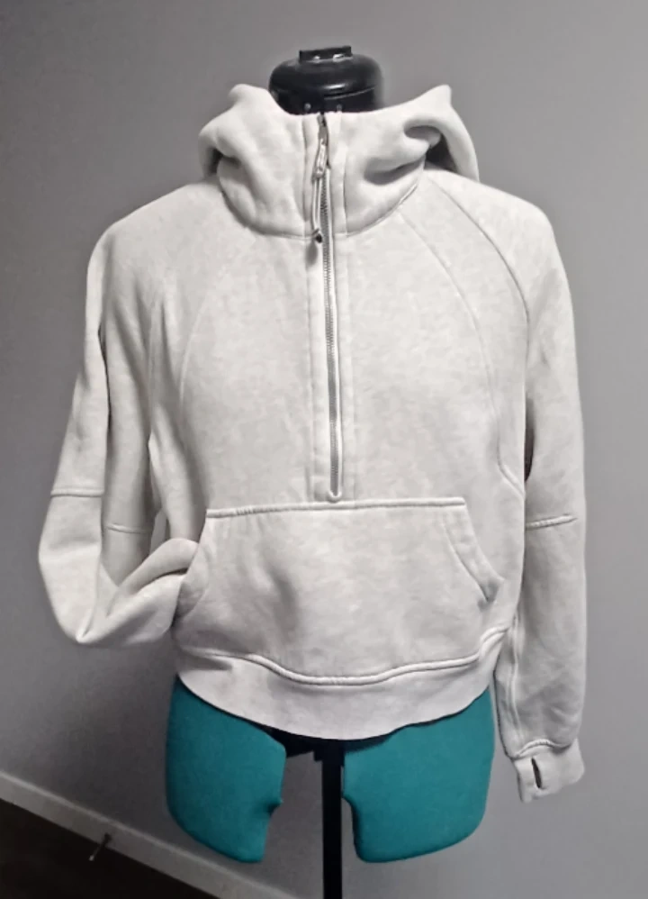 Grey Lululemon hoodie with a half zip closure and a front pouch pocket. It has thumb holes in the sleeves. Made from a soft, comfortable fabric.