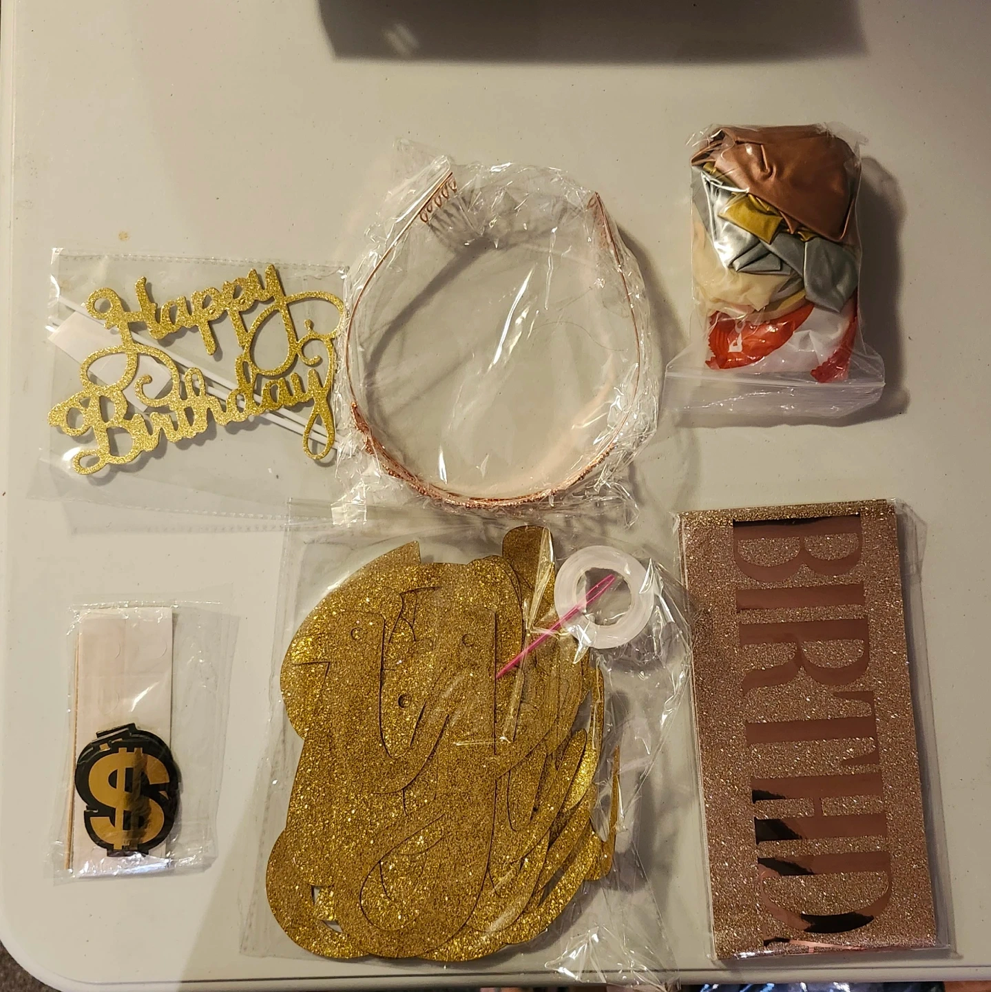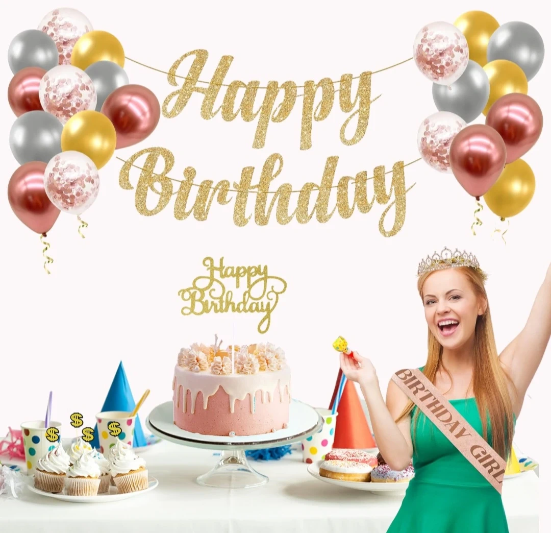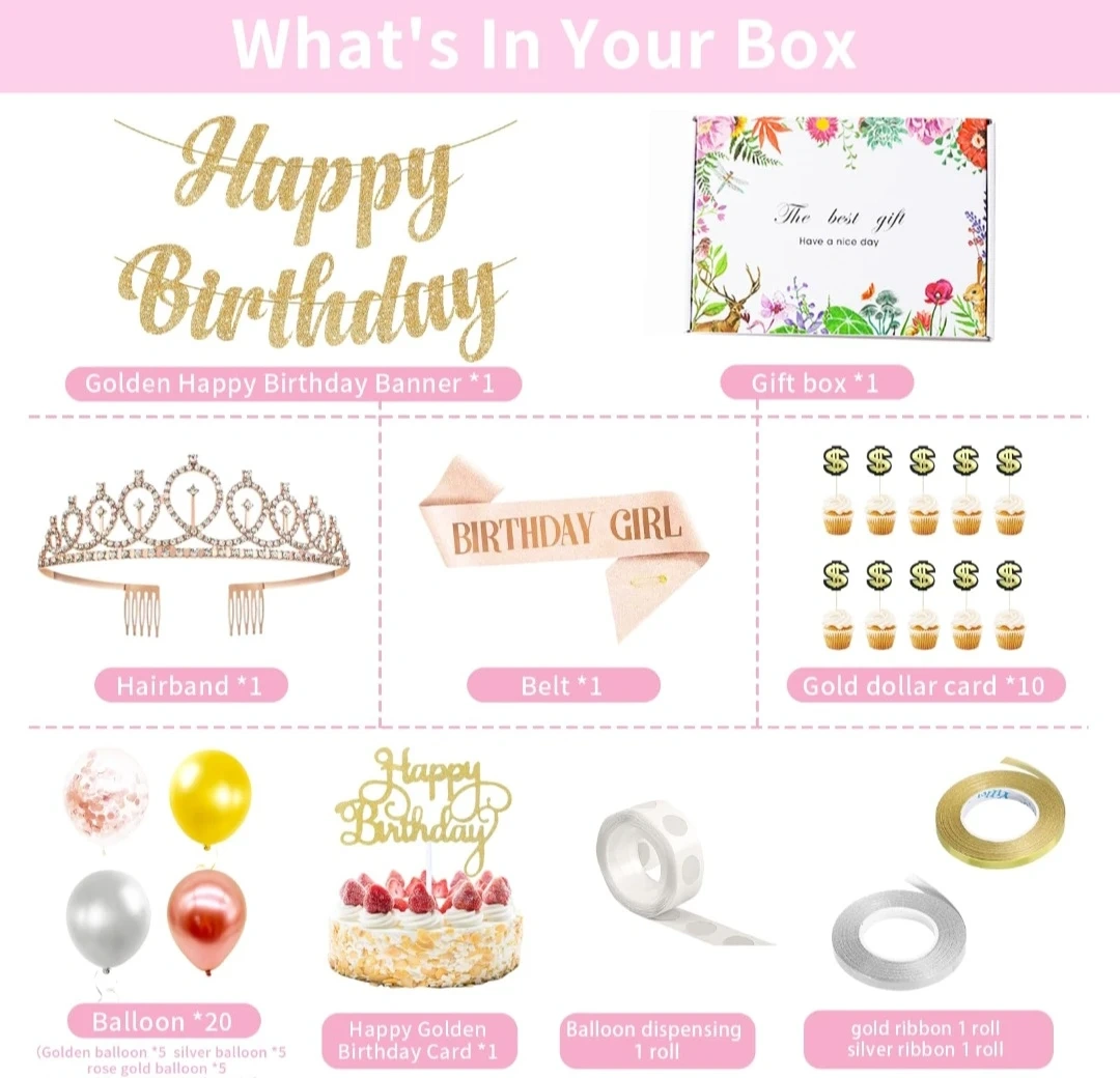 This birthday party decoration set includes a 'Happy Birthday' banner, balloons, a tiara, a 'Birthday Girl' sash, and cupcake toppers. It's everything you need to make a birthday celebration special!