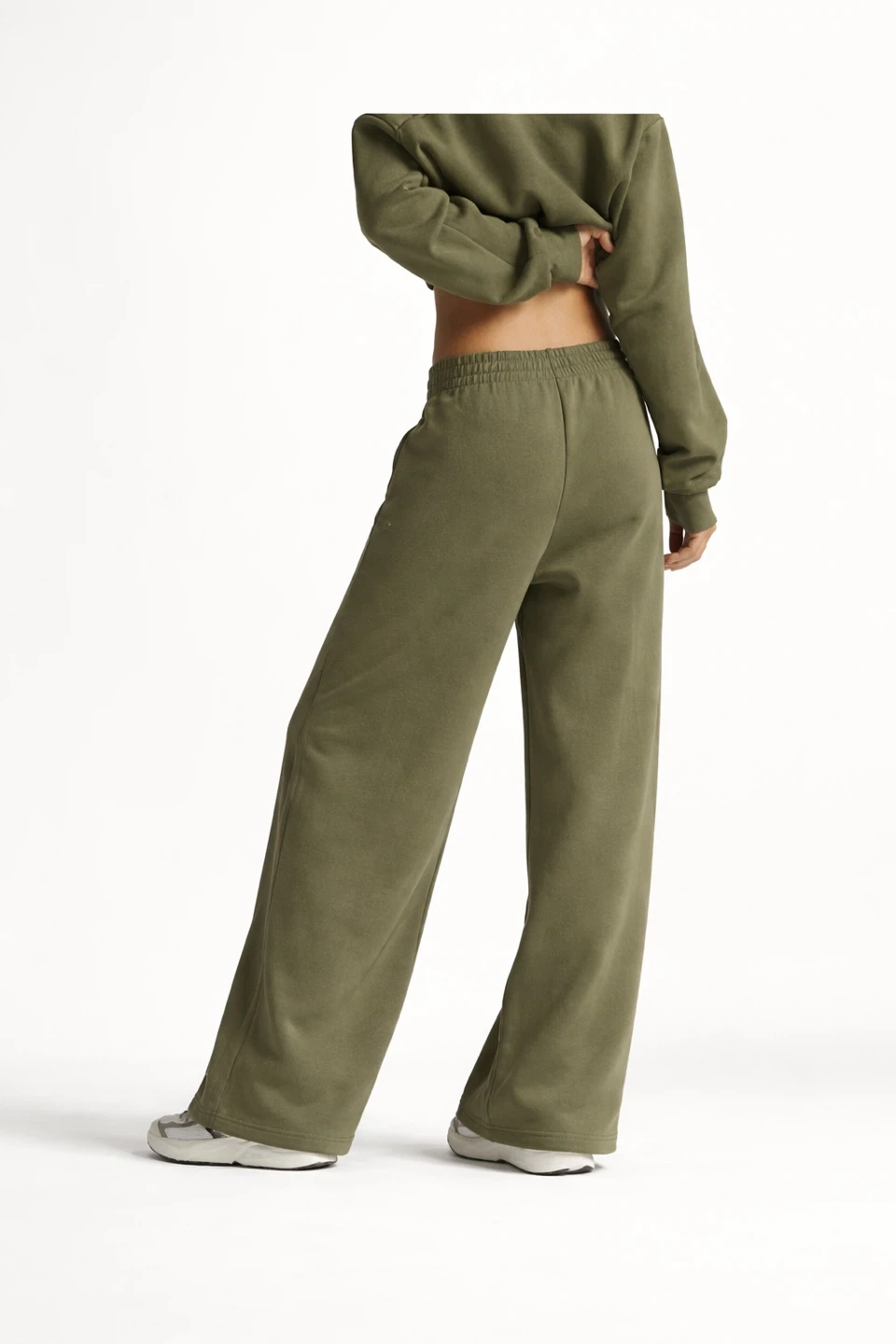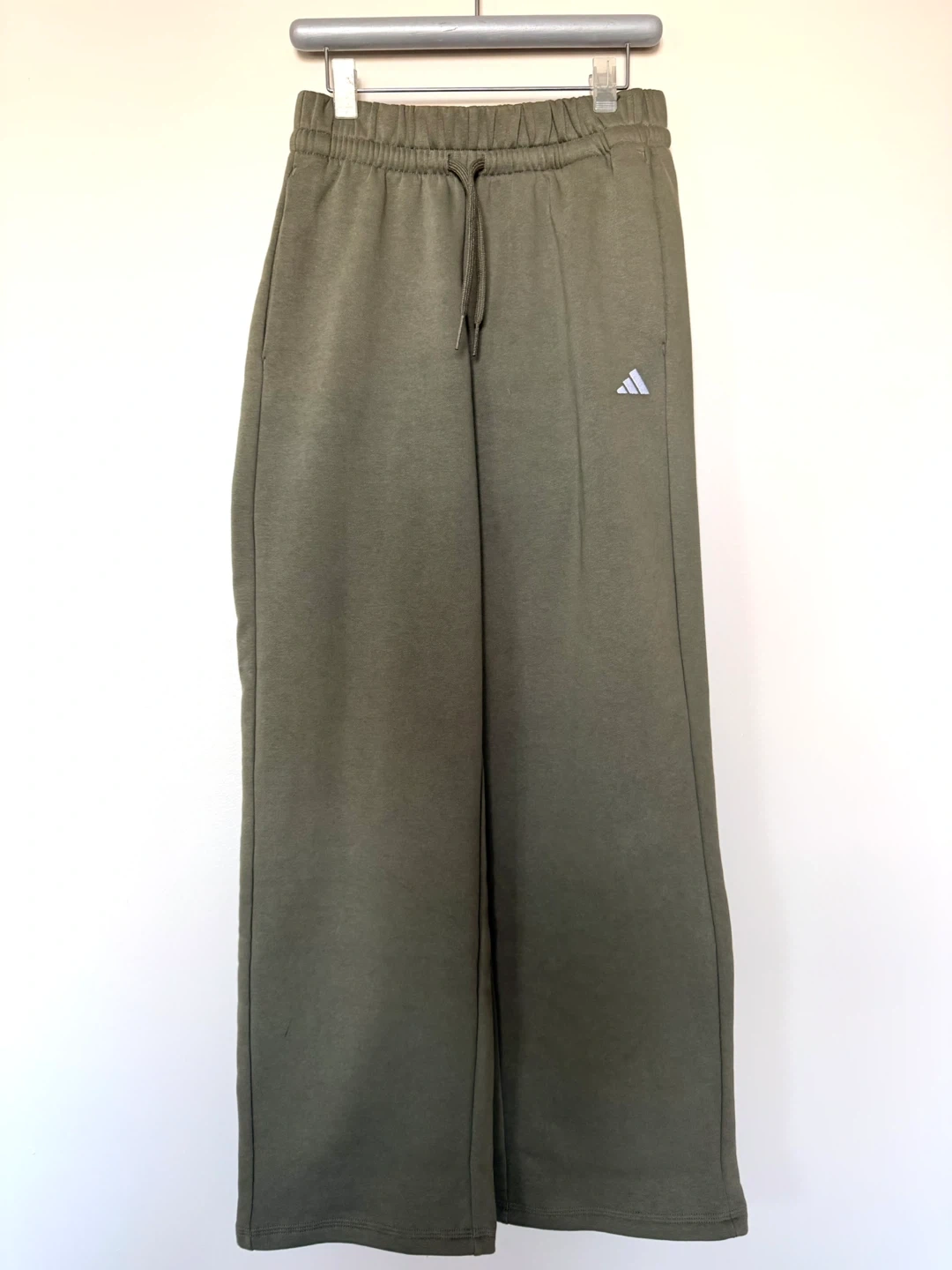Comfortable Adidas wide leg sweatpants in an olive green colour. Elastic waistband with drawstring. It's made from a soft, luxurious fabric for all-day wear. Great for lounging or casual outings!
