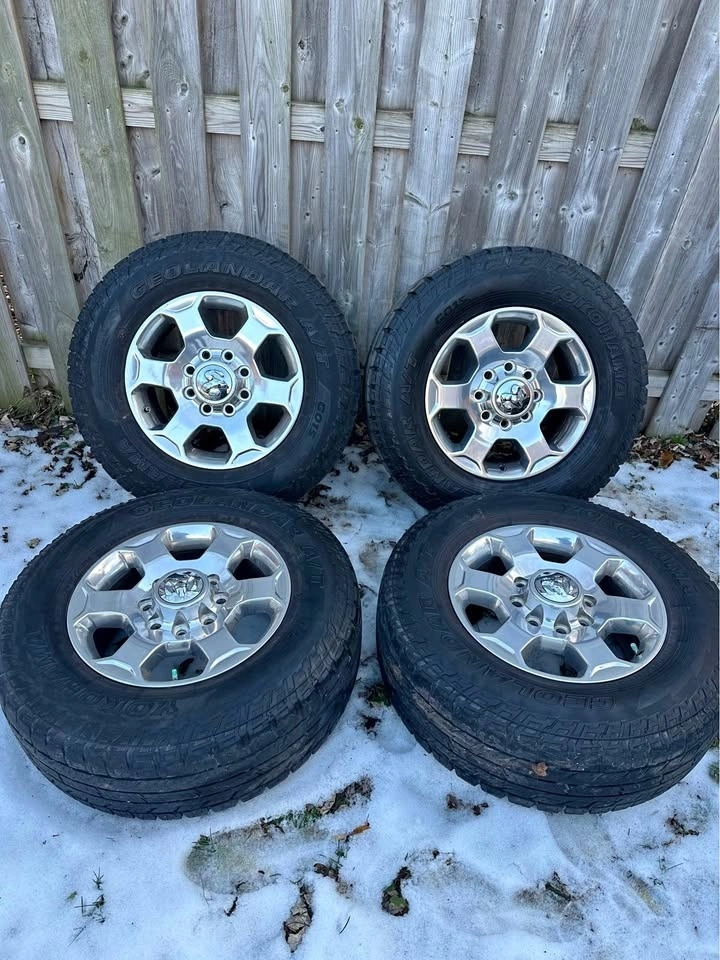 Set of OEM 18-inch rims with Yokohama A/T tires, came off a 2017 Ram 2500. Bolt pattern is 8x6.5, tire size LT275/70R18. Tires have OK tread left. Pickup in Oakville. All prices are subject to HST. We accept credit, debit, e transfer, & cash!