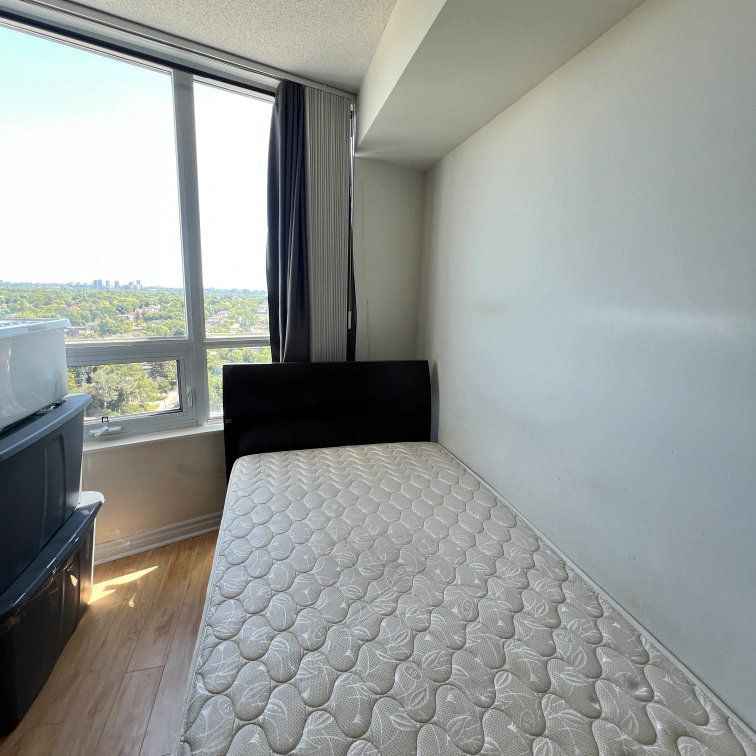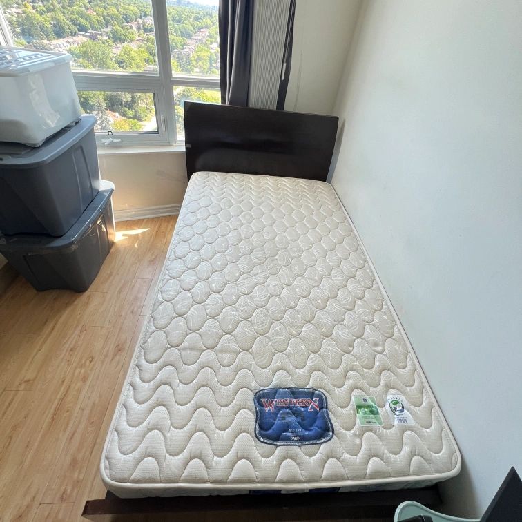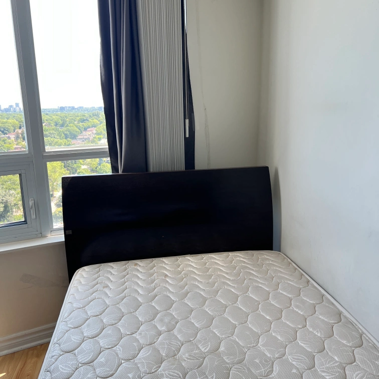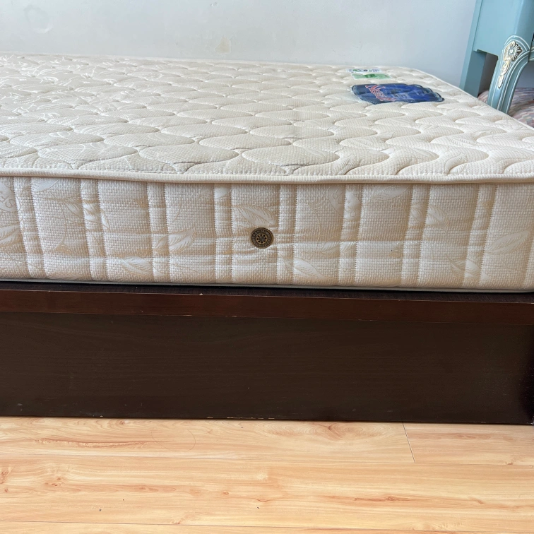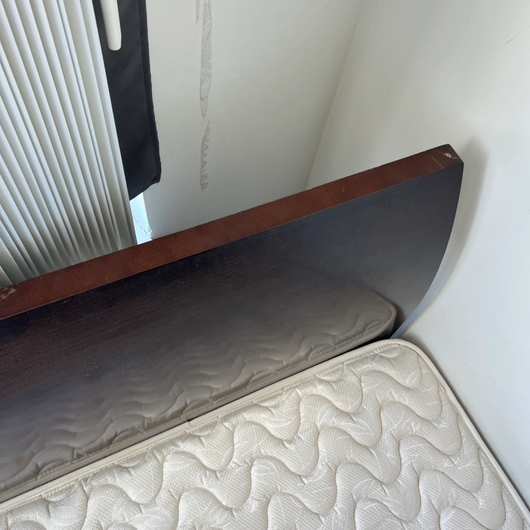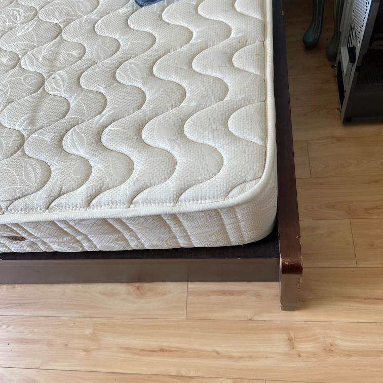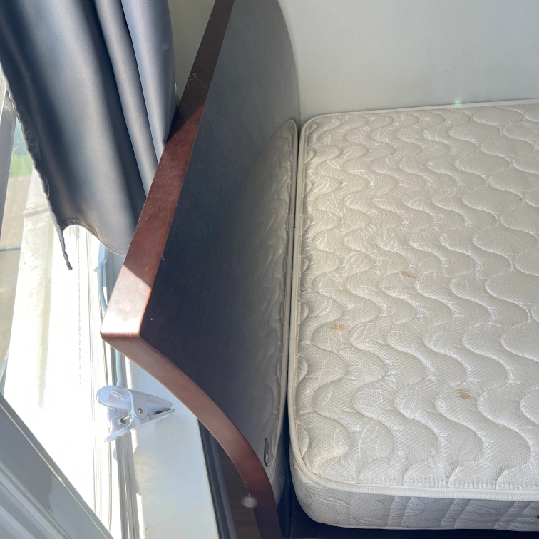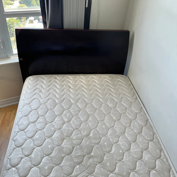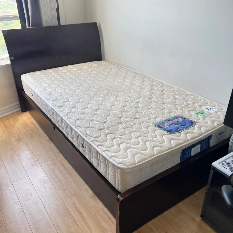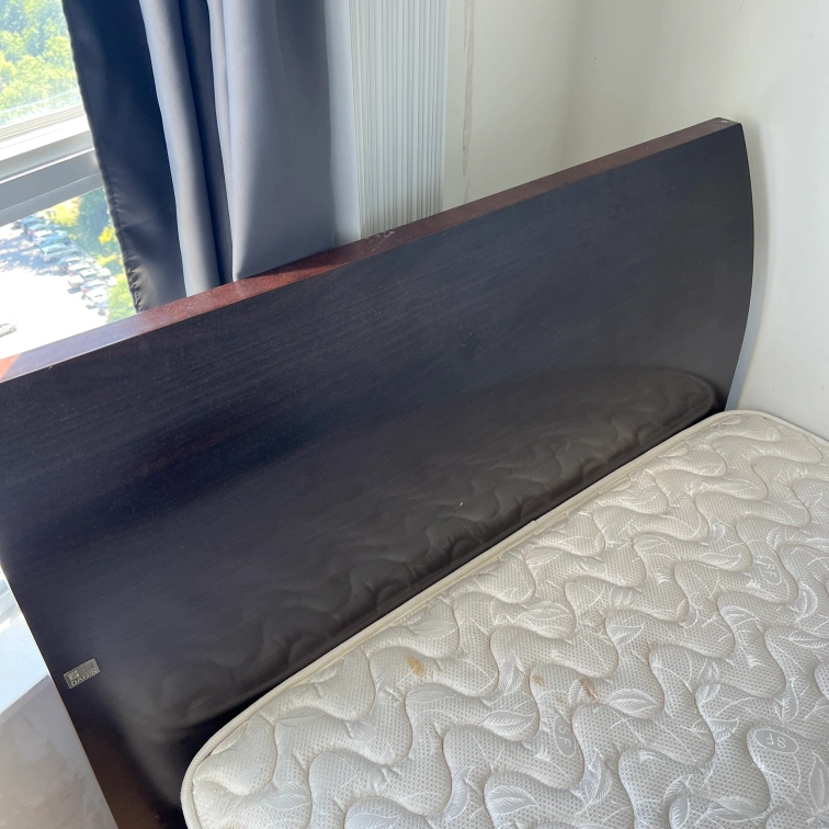 Selling a full size bed frame with a mattress. The bed frame is a dark brown colour. solid wood