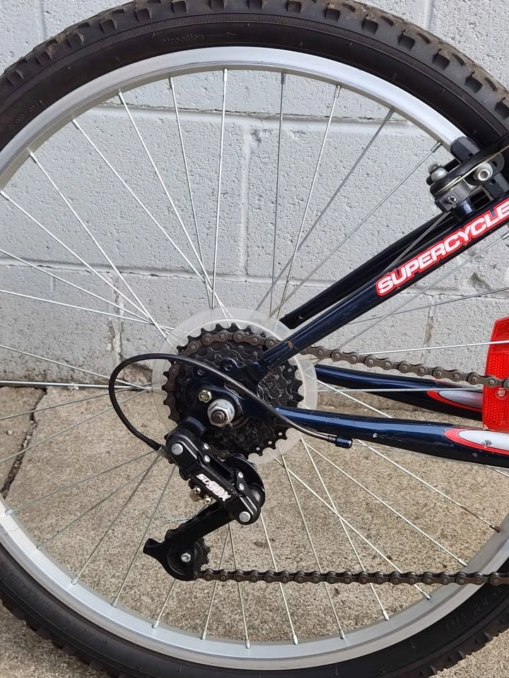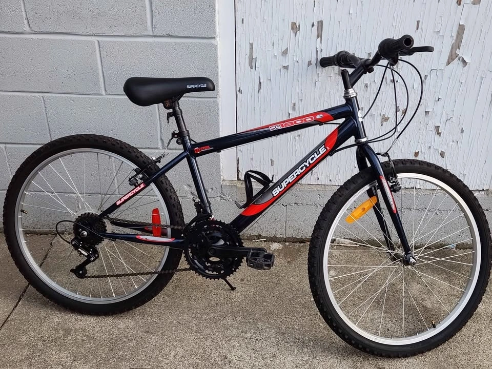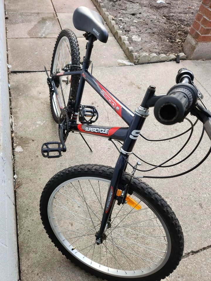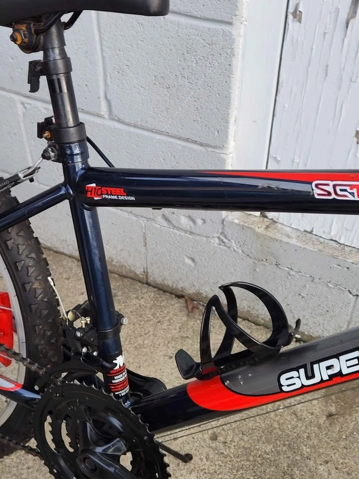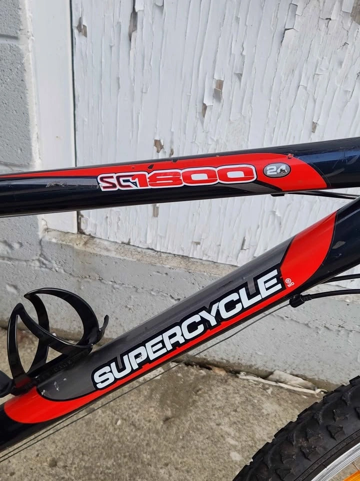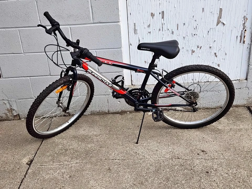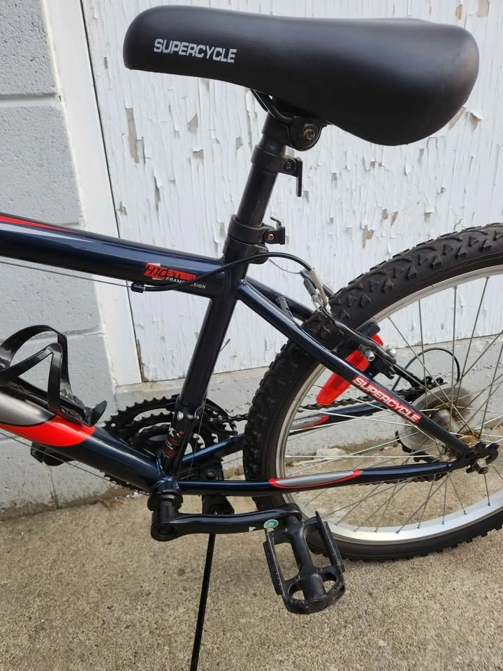 Sturdy Supercycle SG1500 mountain bike. Black and red frame with a kickstand and water bottle holder. Has good tires and all gears work. Great for cruising around or hitting some trails. For ages of 13-18 years. Pick up location between Sheppard and Jane Street.