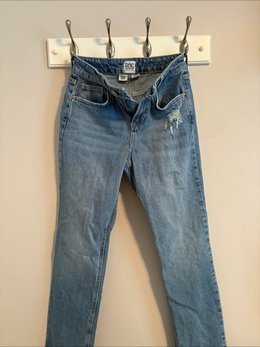 Selling a pair of BDG Urban Outfitters jeans in size 25. They're a light wash denim and in great condition. The style is 'Straight Skinny', so they're fitted but still comfy. Perfect for everyday wear!