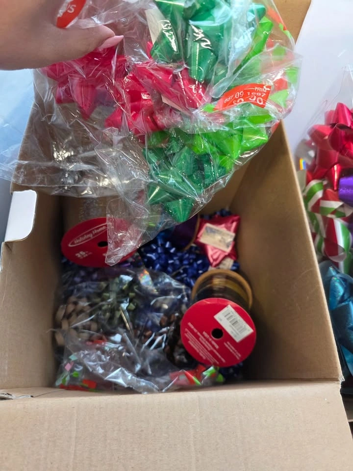 Packed with wrapping paper, ribbons, and gift tags
