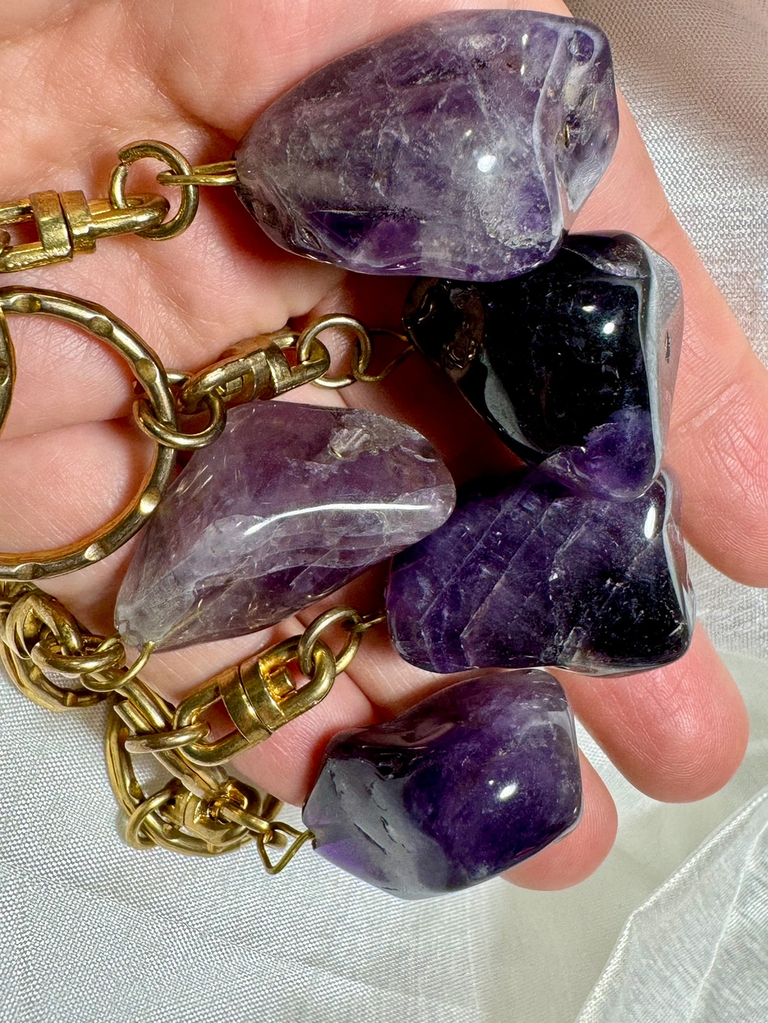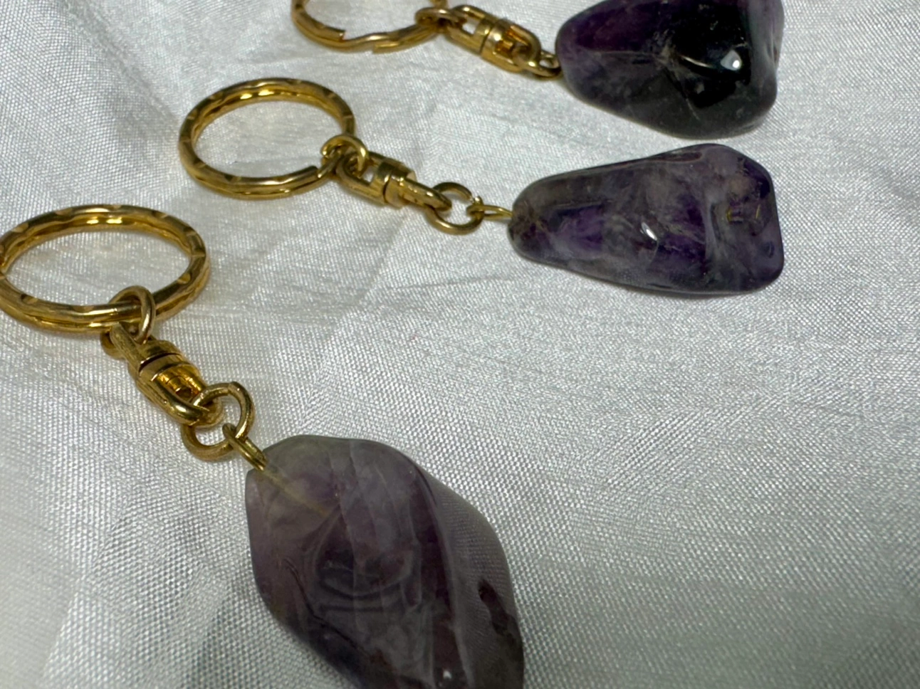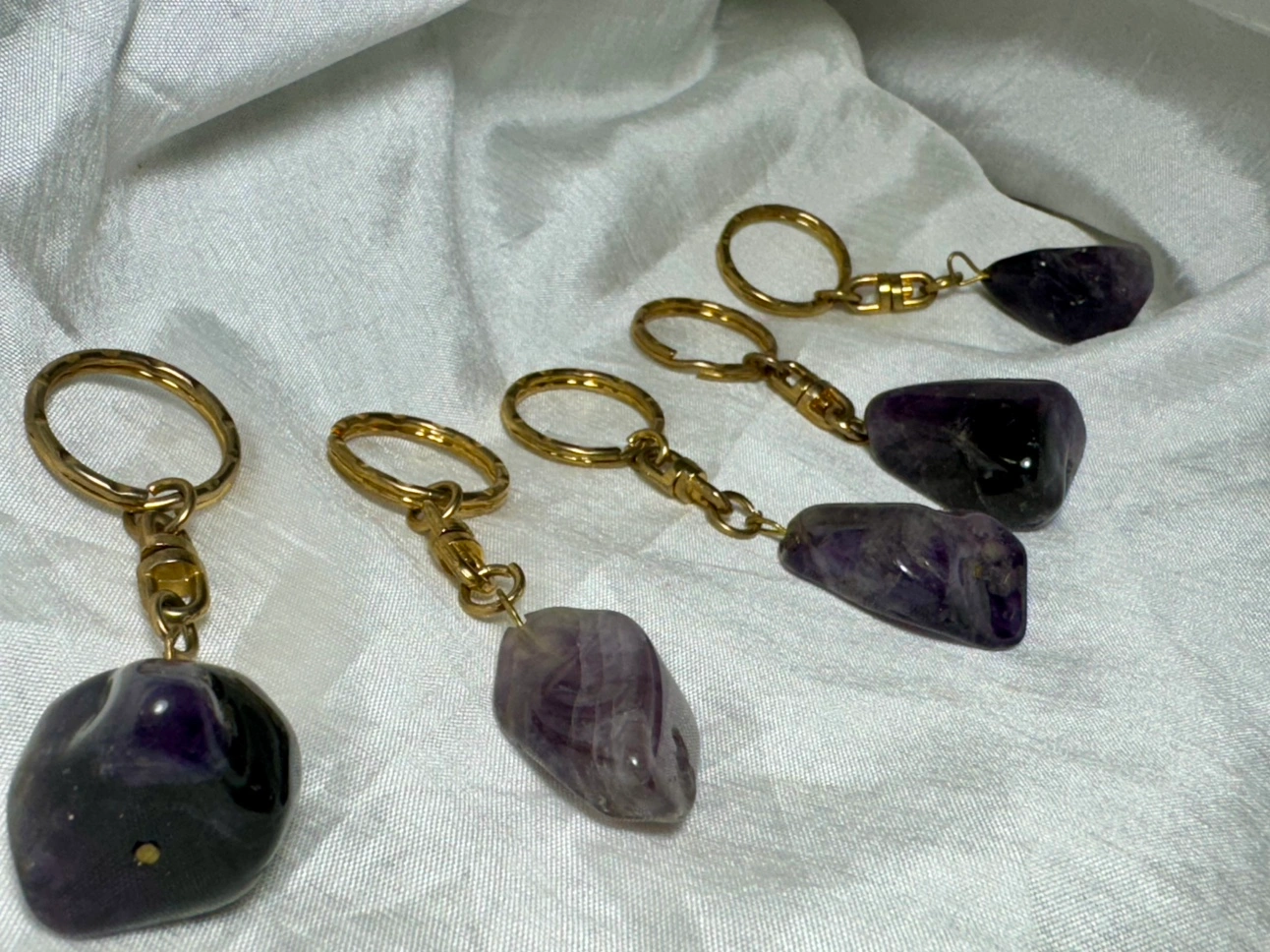 Beautiful natural amethyst keychains. Each keychain has a gold-coloured ring and chain. The amethyst stones are all different shapes and sizes. The keychains are a nice size for everyday use.