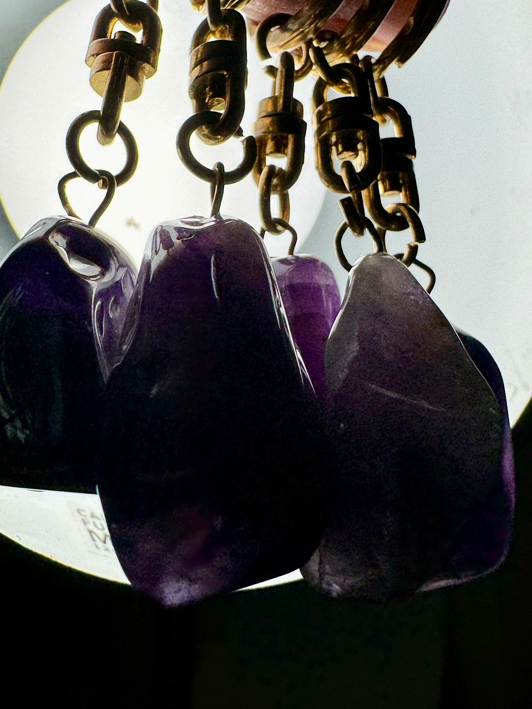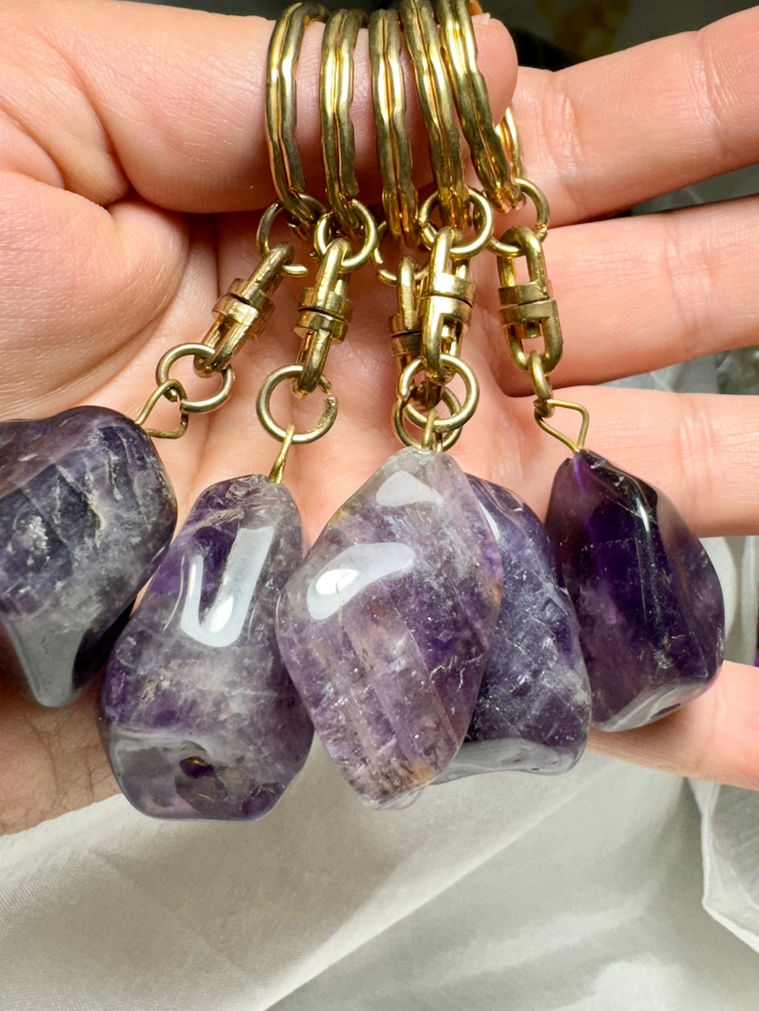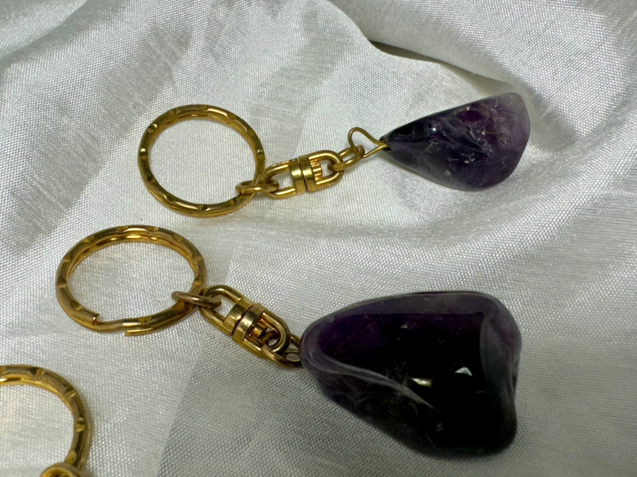 Beautiful natural amethyst keychains. Each keychain has a gold-coloured ring and chain. The amethyst stones are all different shapes and sizes. The keychains are a nice size for everyday use.