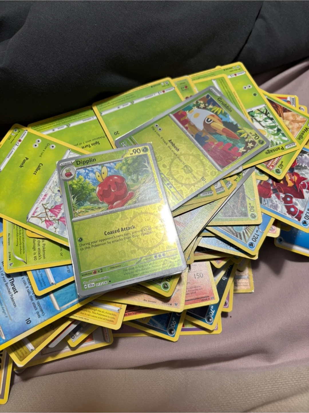 A collection of assorted Pokémon trading cards. These cards are great for any Pokémon fan looking to expand their collection. They're perfect for gameplay or display!