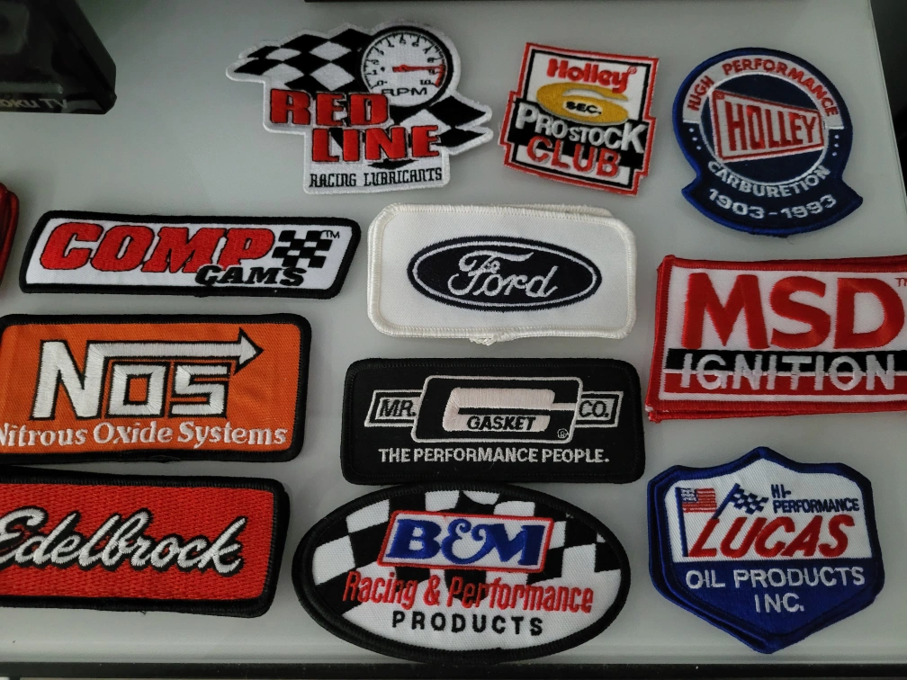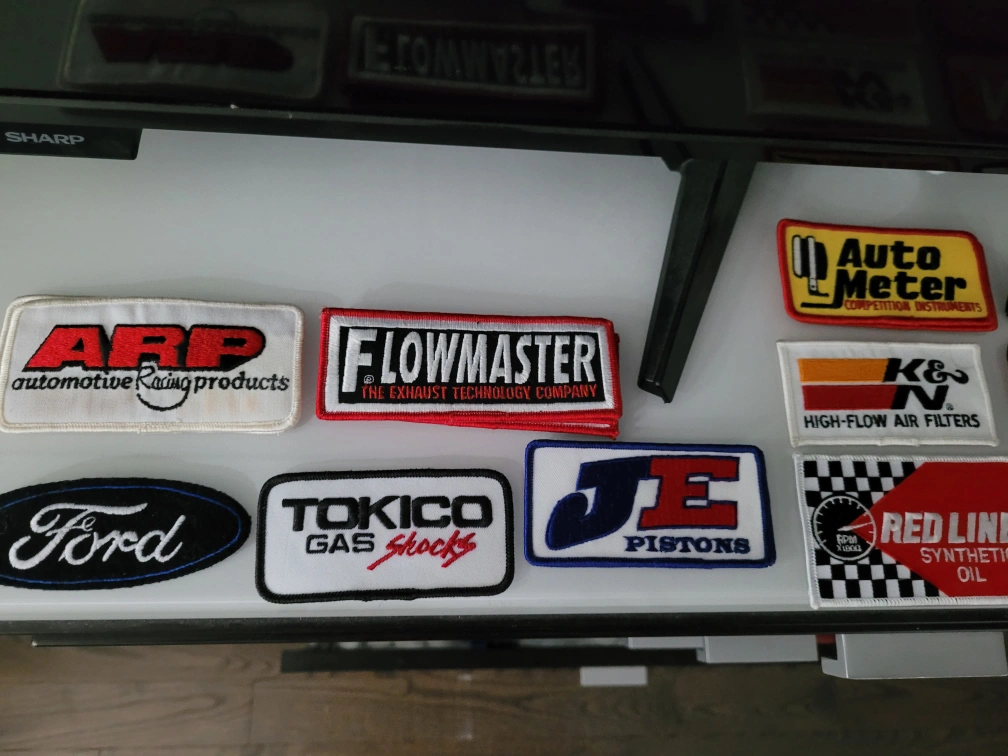 Large collection of embroidered patches. Features various well-known automotive brands and racing parts. Ideal for jackets, bags, or collectors.