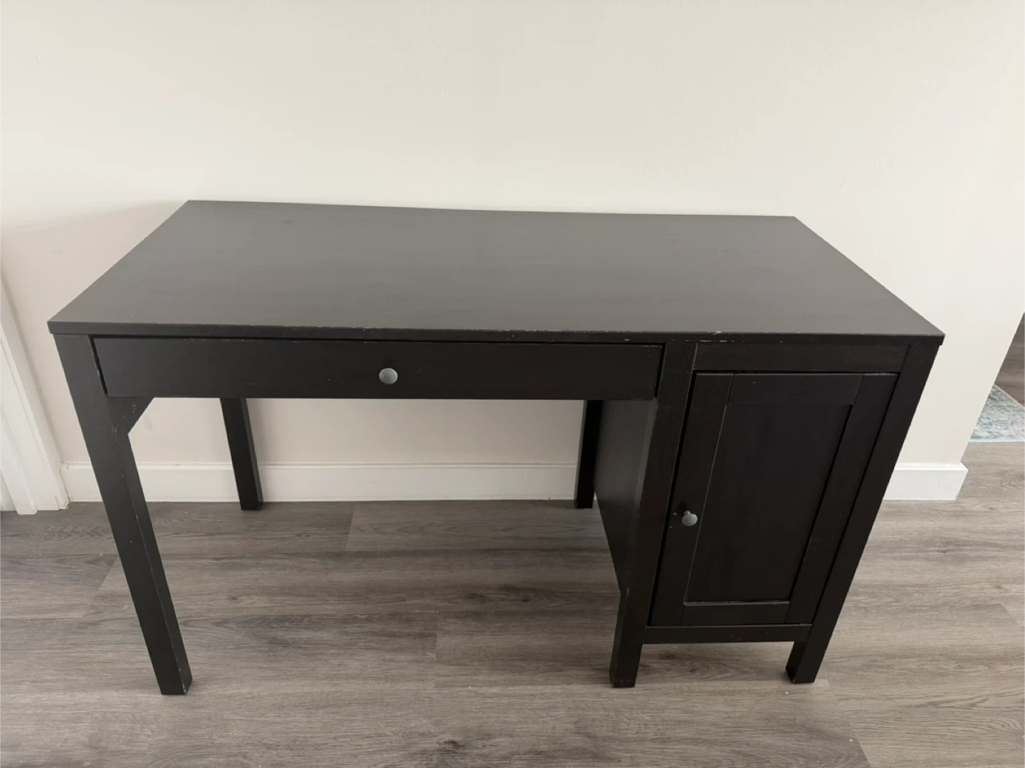 This dark brown writing desk has one drawer and a cabinet for storage. The cabinet has an adjustable shelf inside. It's made of wood and measures approximately 47*21 inches.