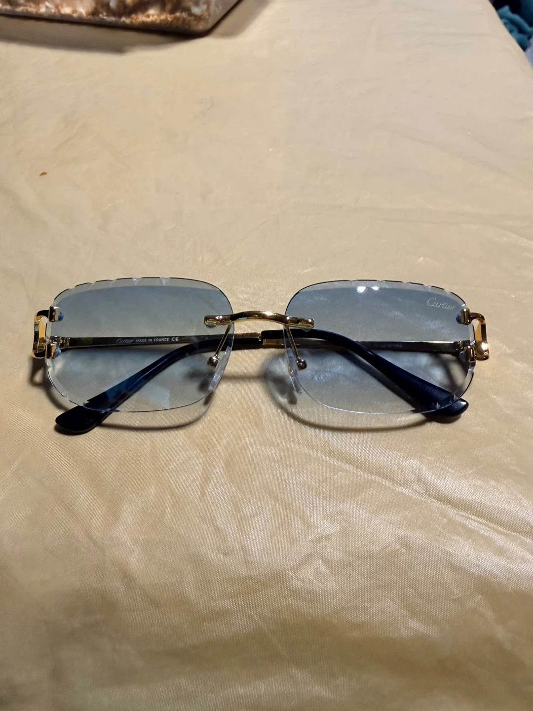 These Cartier sunglasses have a rimless design with gold-tone accents and gradient lenses. Made in France. CE marked.