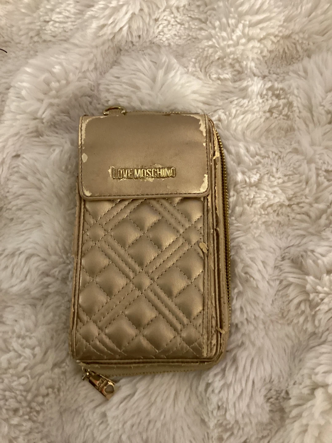 This is a gold, quilted wallet from Love Moschino. It's designed to hold a phone and has multiple card slots. The zipper closure ensures everything stays secure. It's great for carrying your essentials on the go!