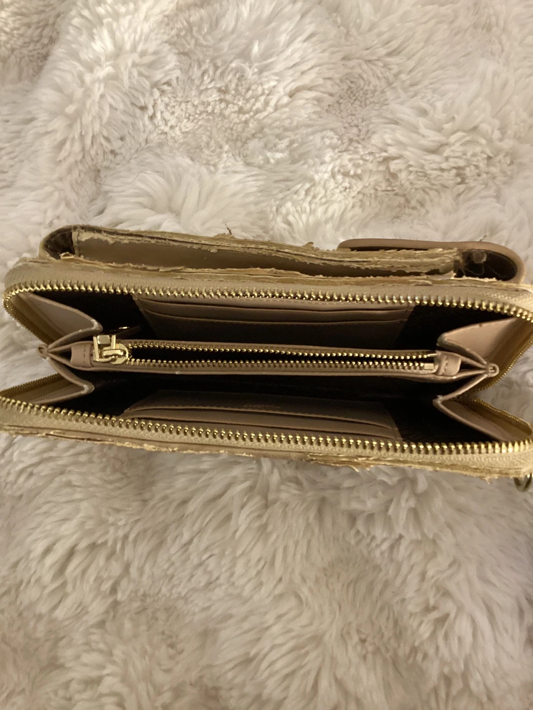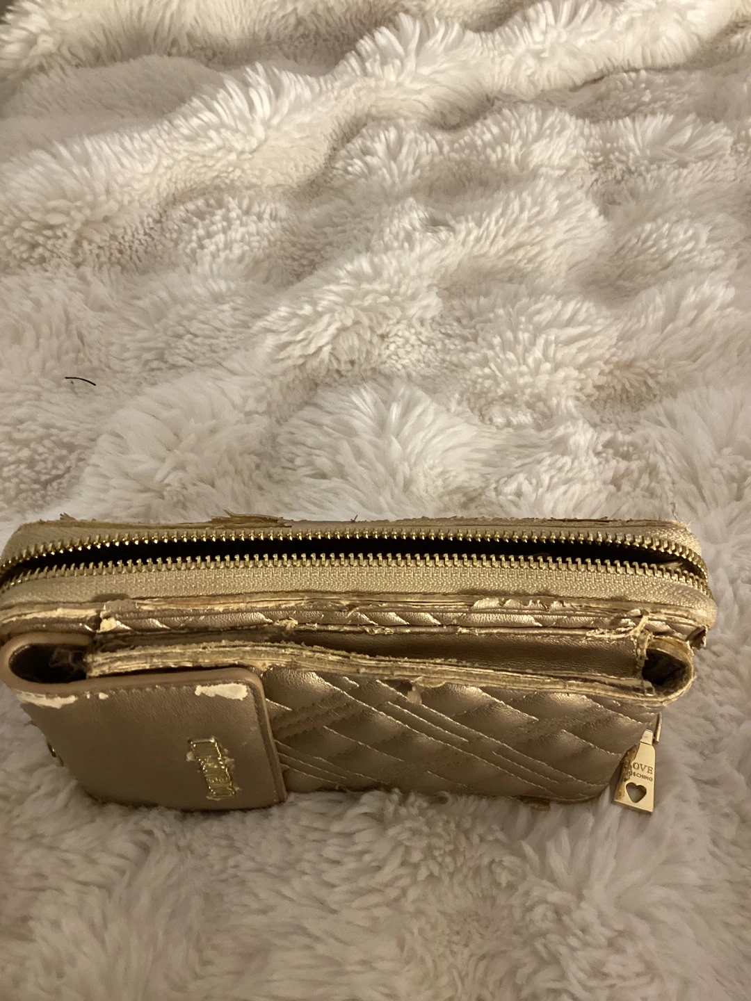 This is a gold, quilted wallet from Love Moschino. It's designed to hold a phone and has multiple card slots. The zipper closure ensures everything stays secure. It's great for carrying your essentials on the go!