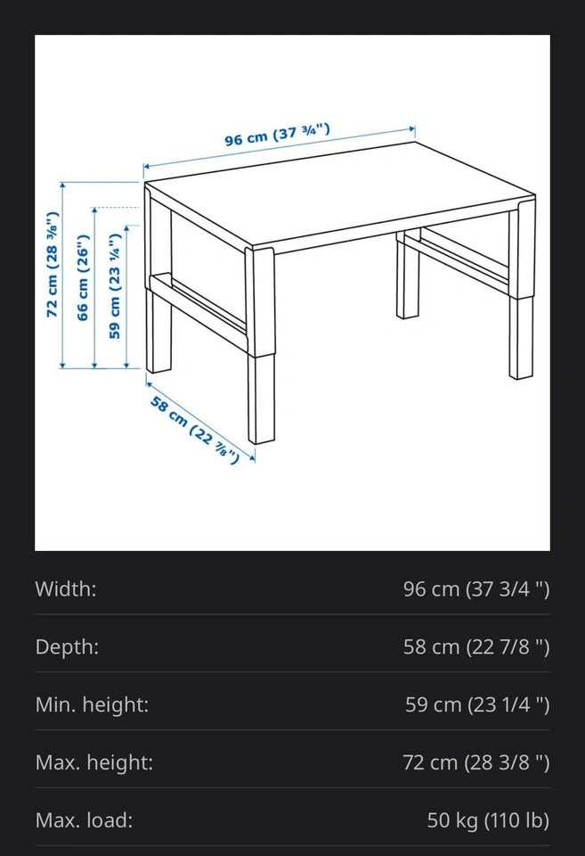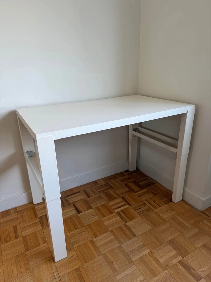 The desk is easily adjusted to 23", 26", or 28" using the knobs on the legs. You can keep cables and extension cords organized by placing them in the cable holders between the front and back legs.