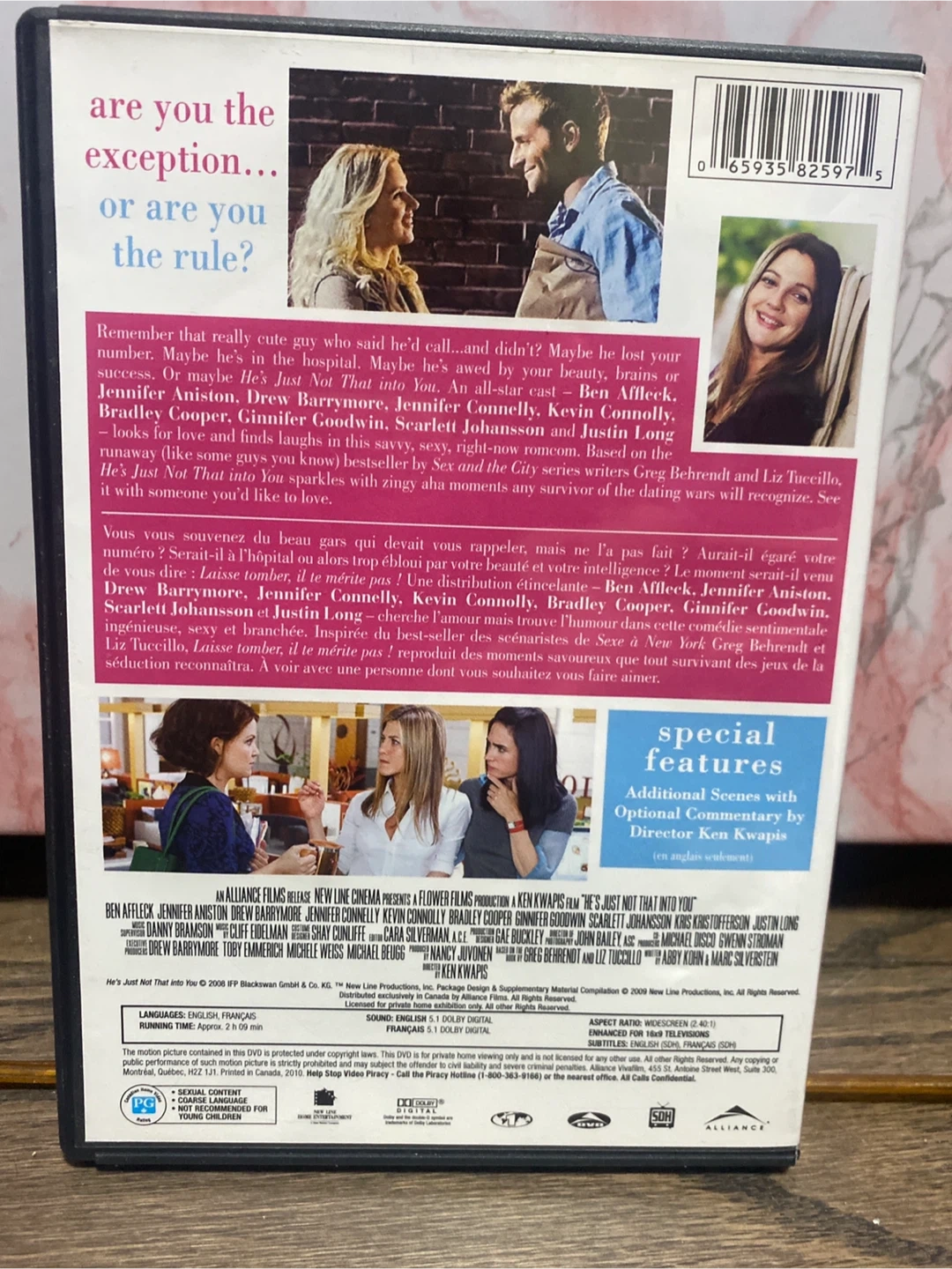 Selling a DVD of the movie "He's Just Not That Into You". This all-star cast includes Ben Affleck, Jennifer Aniston, Drew Barrymore, Jennifer Connelly, Kevin Connolly, Bradley Cooper, Ginnifer Goodwin, Scarlett Johansson and Justin Long. It also includes special features with optional commentary by Director Ken Kwapis