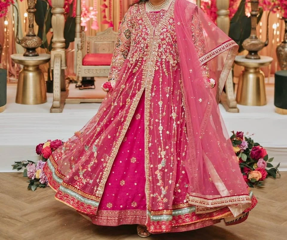 Wedding formal dress, perfect for a close family wedding. This is a Size XL, 4-piece set including a heavily embellished jacket, inner shirt, lengha, and dupatta. The mini version is perfect for a 2-4 year old and includes the jacket and inner shirt. This is an exact replica of a Mina Hasan dress. Worn once and in perfect condition. Asking $650 OBO for both.