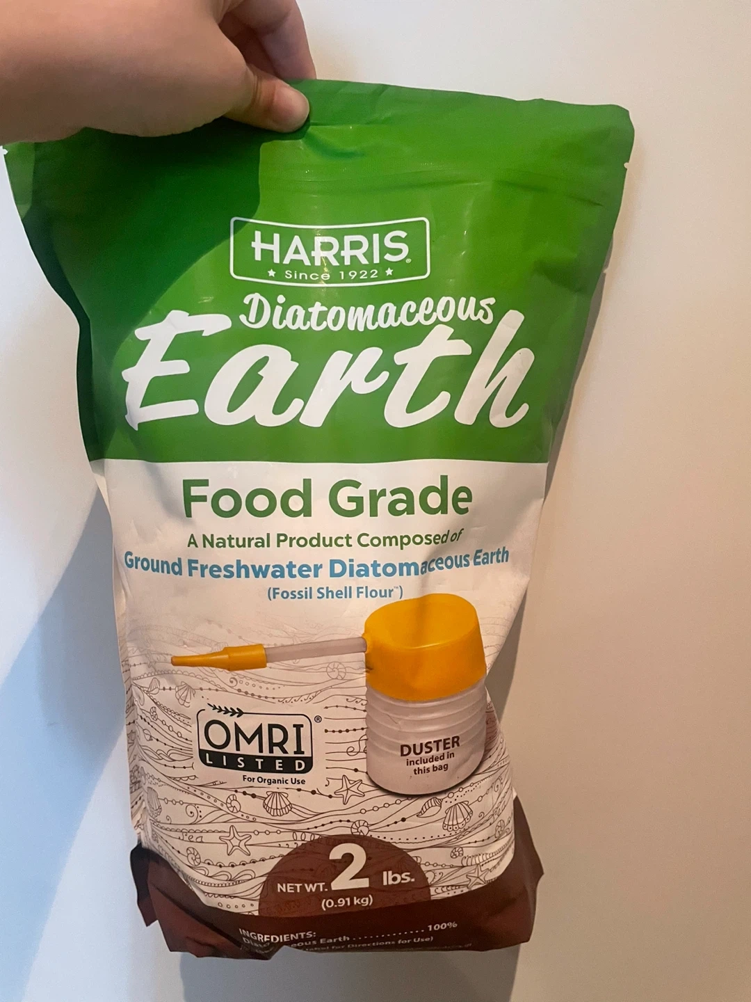 Harris Food Grade Diatomaceous Earth. It's a natural product composed of ground freshwater diatomaceous earth (fossil shell flour). OMRI Listed for organic use. Includes a duster in this bag.