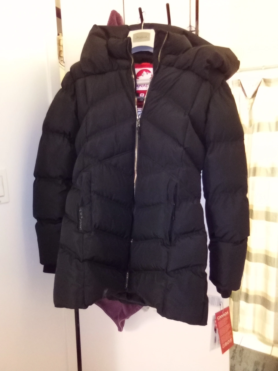 Women's black puffer jacket. Features a awesome hood. Designed in Canada. Excellent condition. suggested 260 price . Coat fits like a snugg Large.