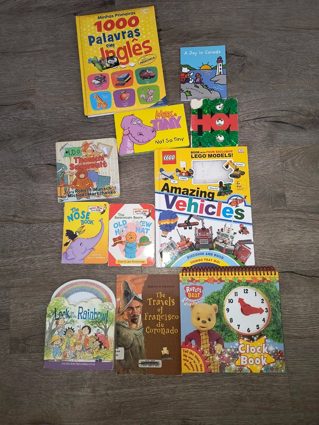 This bundle includes a variety of children's books for different ages and interests. You'll find 'Minhas Primeiras 1000 Palavras em Inglês', 'Thomas Snowsuit', 'The Nose Book', 'A Day in Canada', 'Max & Tiny: Not So Tiny', 'The Berenstain Bears: Old Hat New Hat', 'Amazing Vehicles' LEGO book, 'Look for the Rainbow', 'The Travels of Francisco de Coronado', and 'Rupert Bear's Clock Book'.