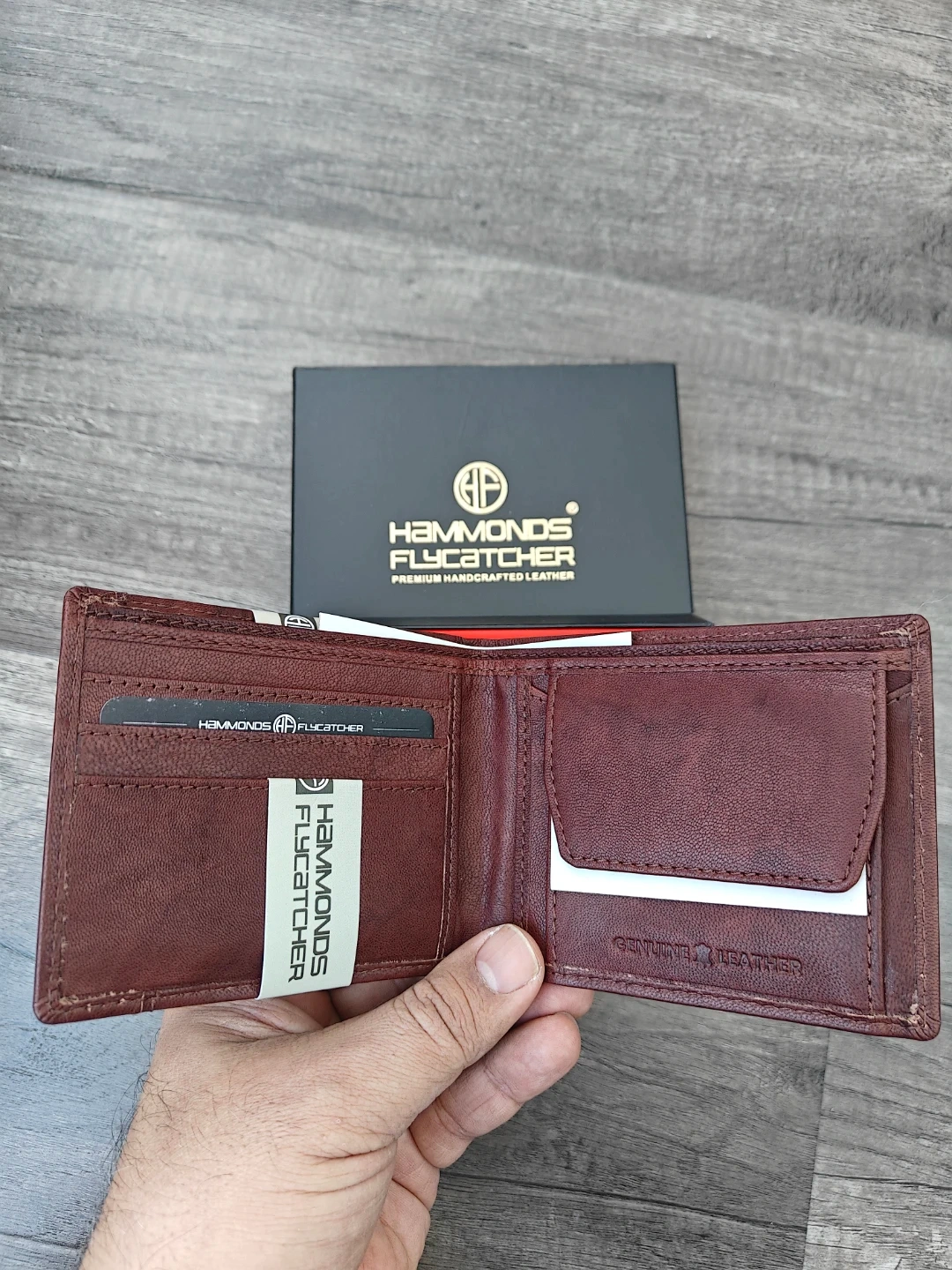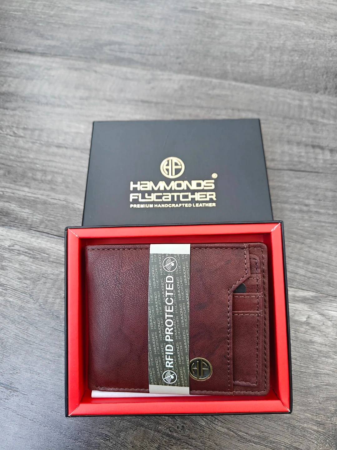 Hammonds Flycatcher bifold wallet in premium handcrafted leather. Includes RFID protection and a coin pocket. Genuine leather construction.