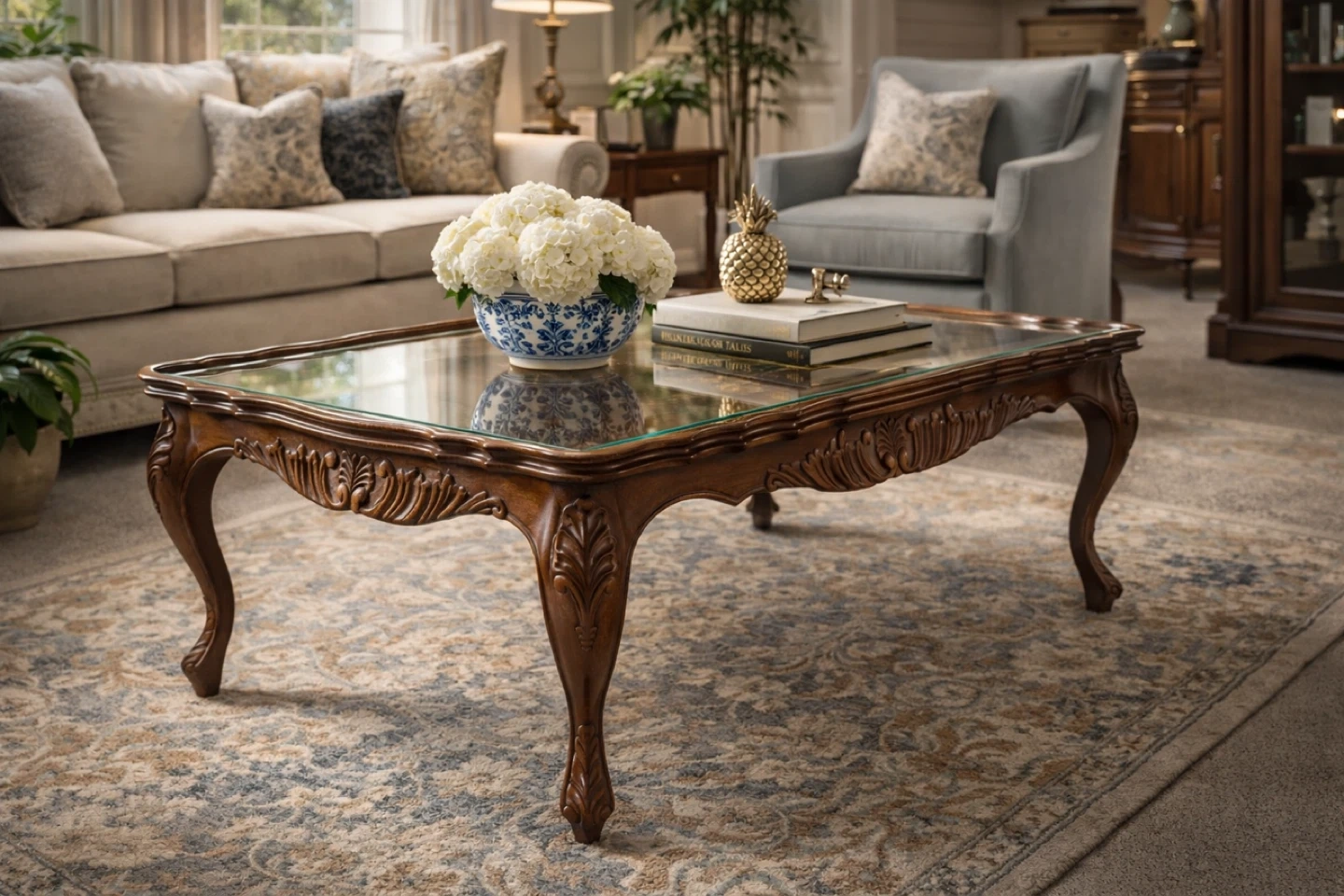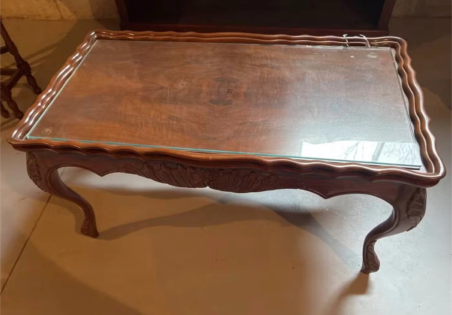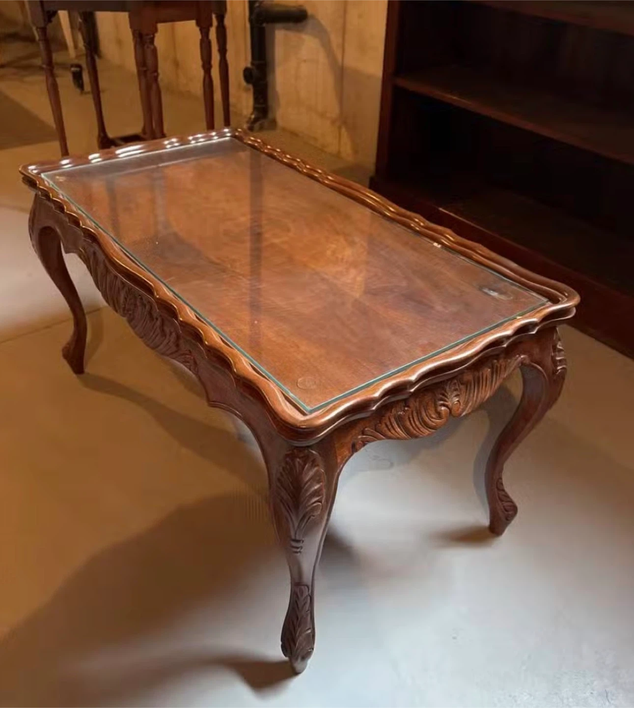 Lovely coffee table with detailed wood carvings. It features a durable glass top inset into the wooden frame. This table adds an elegant touch to any living space.