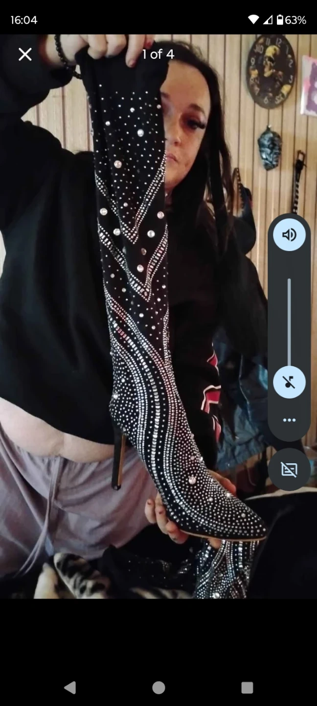 These stunning black boots are covered in dazzling rhinestones! They feature a pointed toe and a sleek stiletto heel, perfect for making a statement. These boots are designed to turn heads!