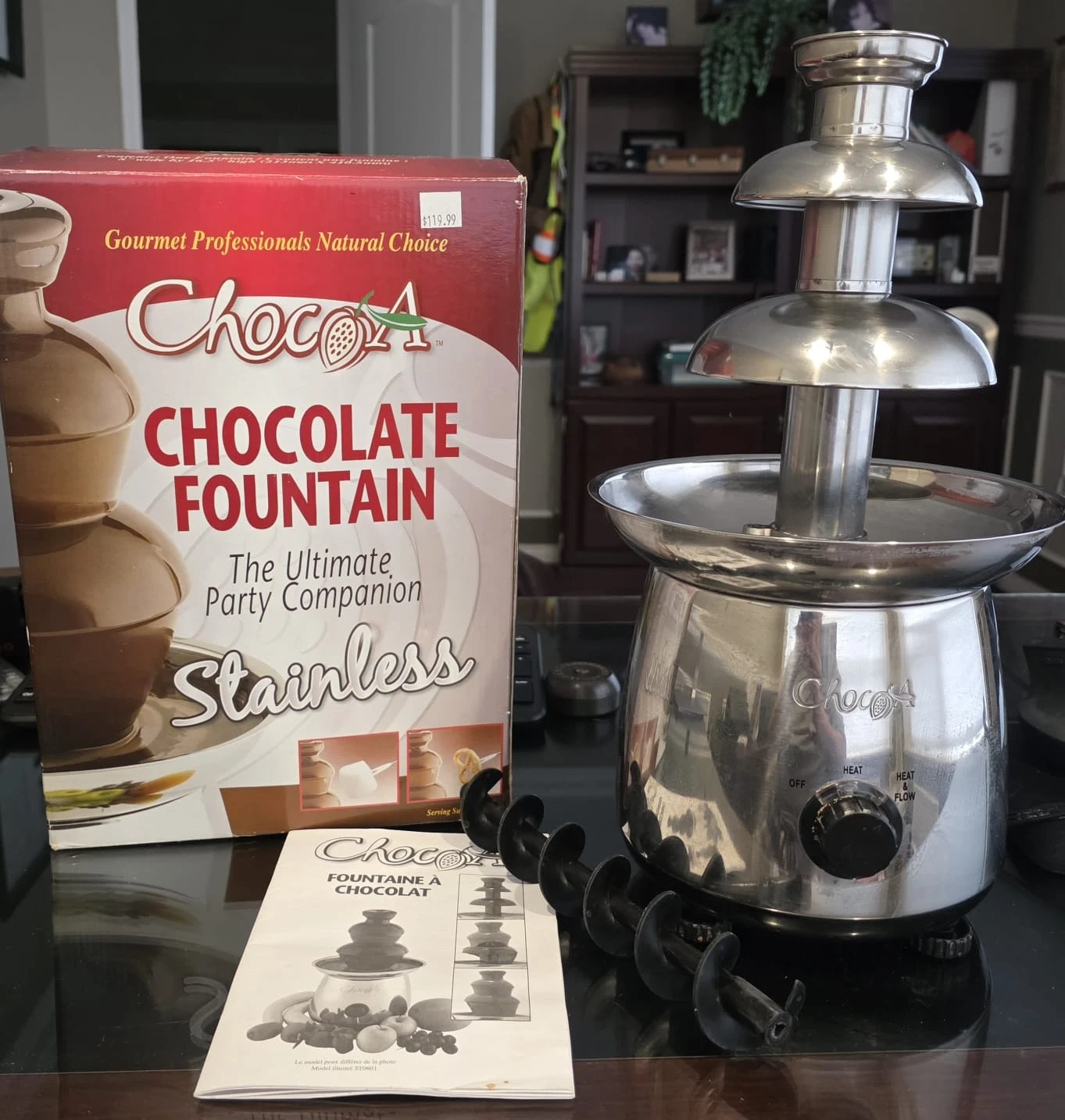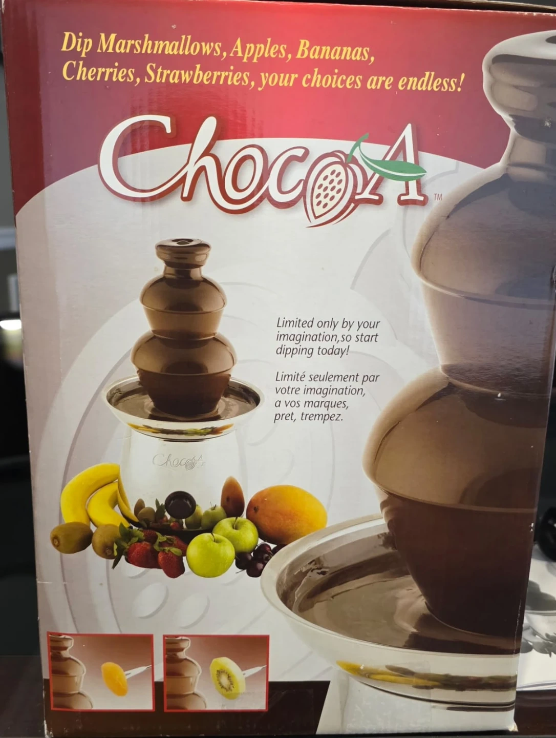 This Chocola chocolate fountain is a party companion. It's made of stainless steel. Perfect for dipping marshmallows, apples, and bananas!