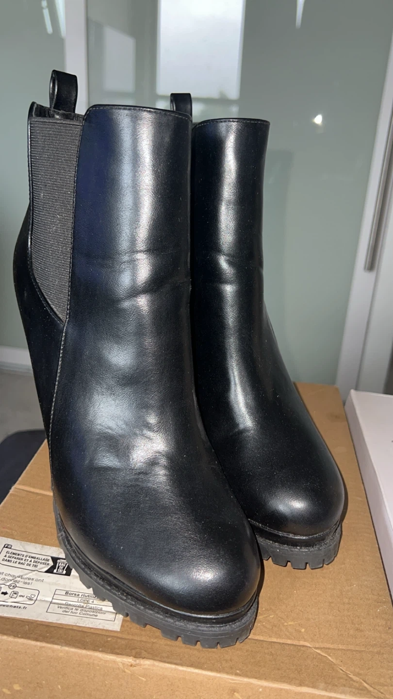 Black Chelsea wedge boots with elastic side panels. These boots are made of a smooth material and feature a chunky sole. Great for everyday wear!