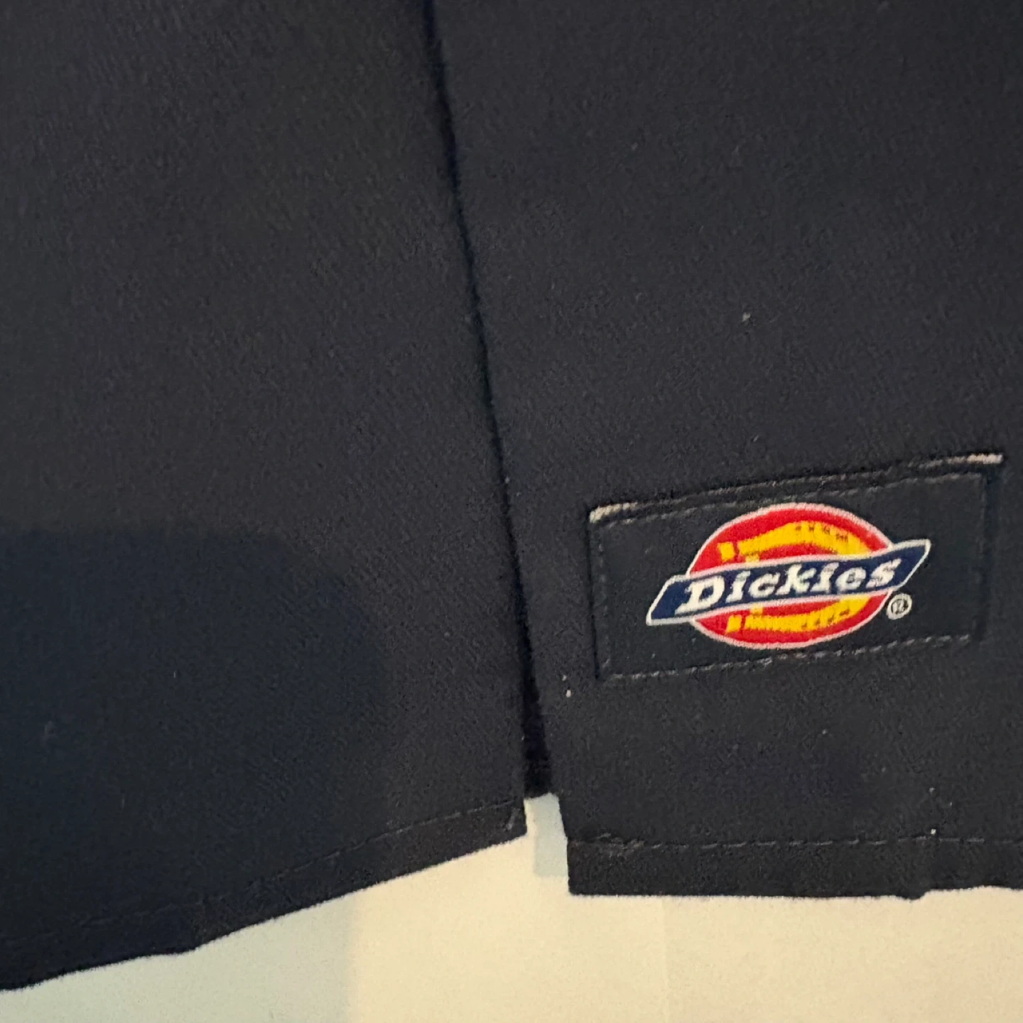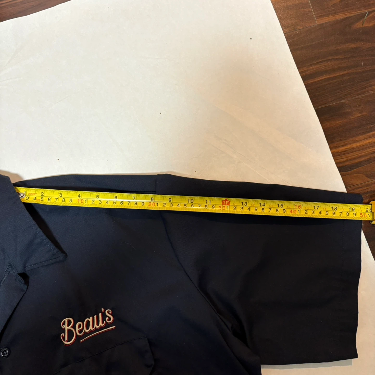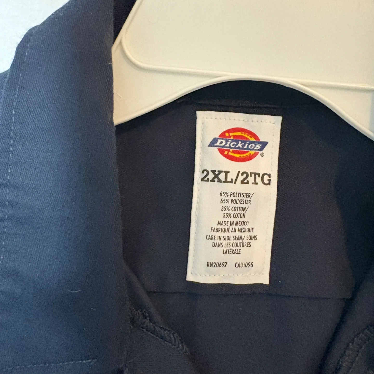 Dickies work shirt in size 2XL. It's a dark blue colour and made of 65% polyester and 35% cotton. Has a tractor and the name 'Beau's' embroidered on the front