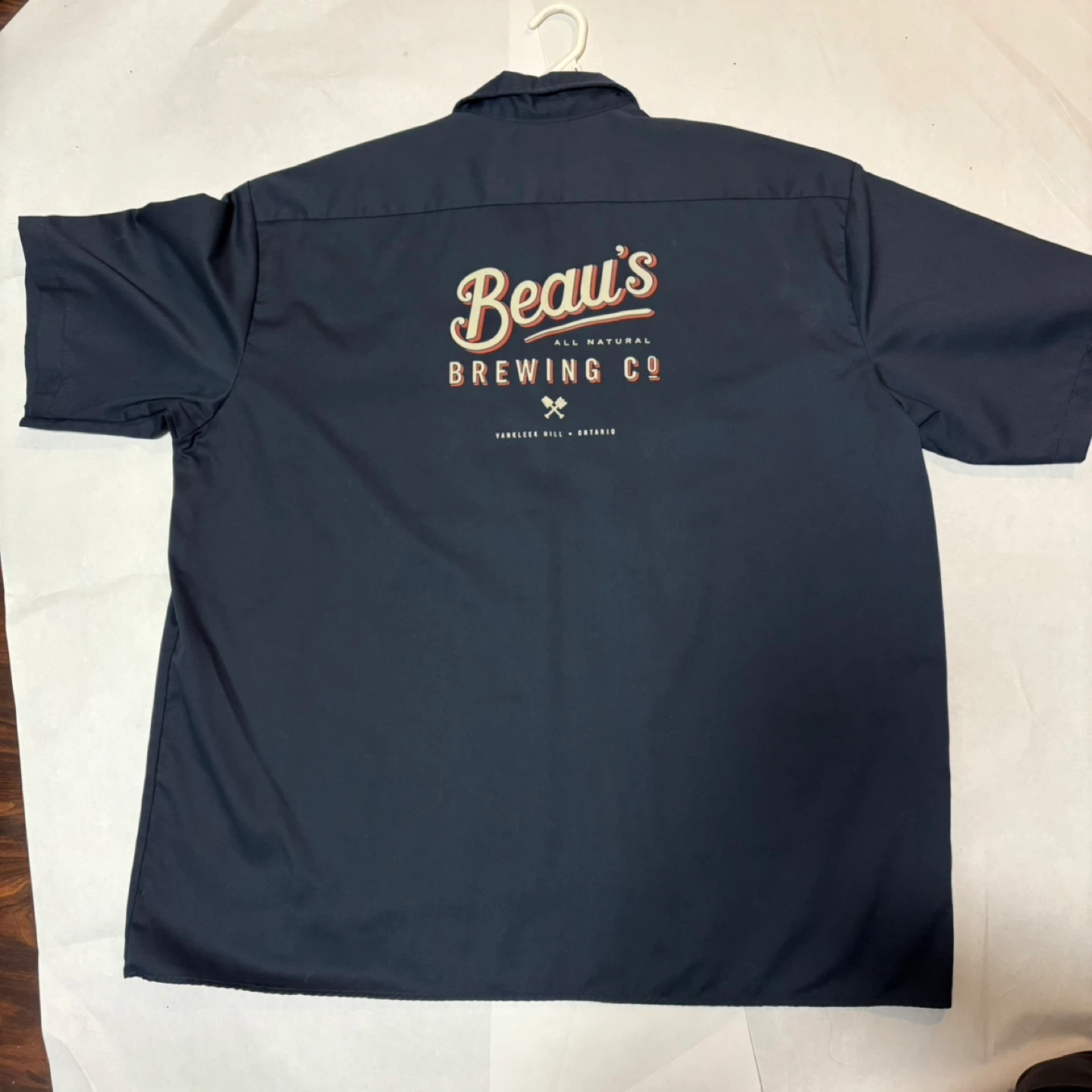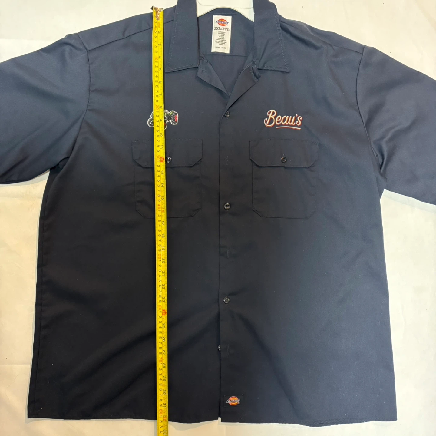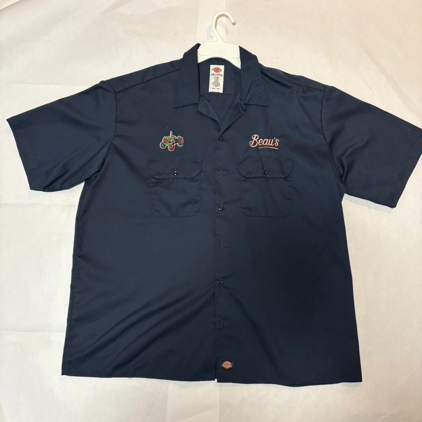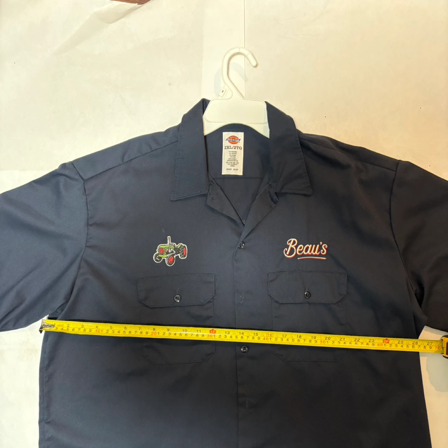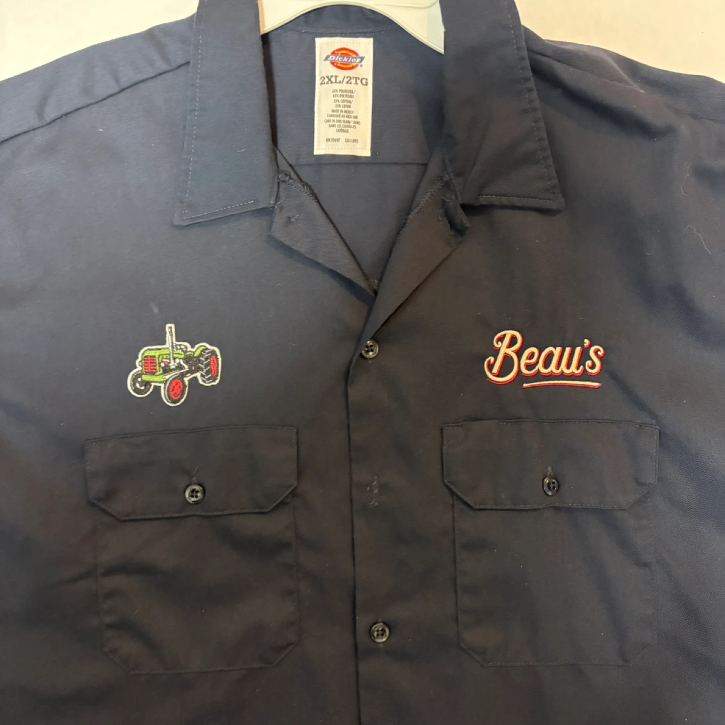 Dickies work shirt in size 2XL. It's a dark blue colour and made of 65% polyester and 35% cotton. Has a tractor and the name 'Beau's' embroidered on the front