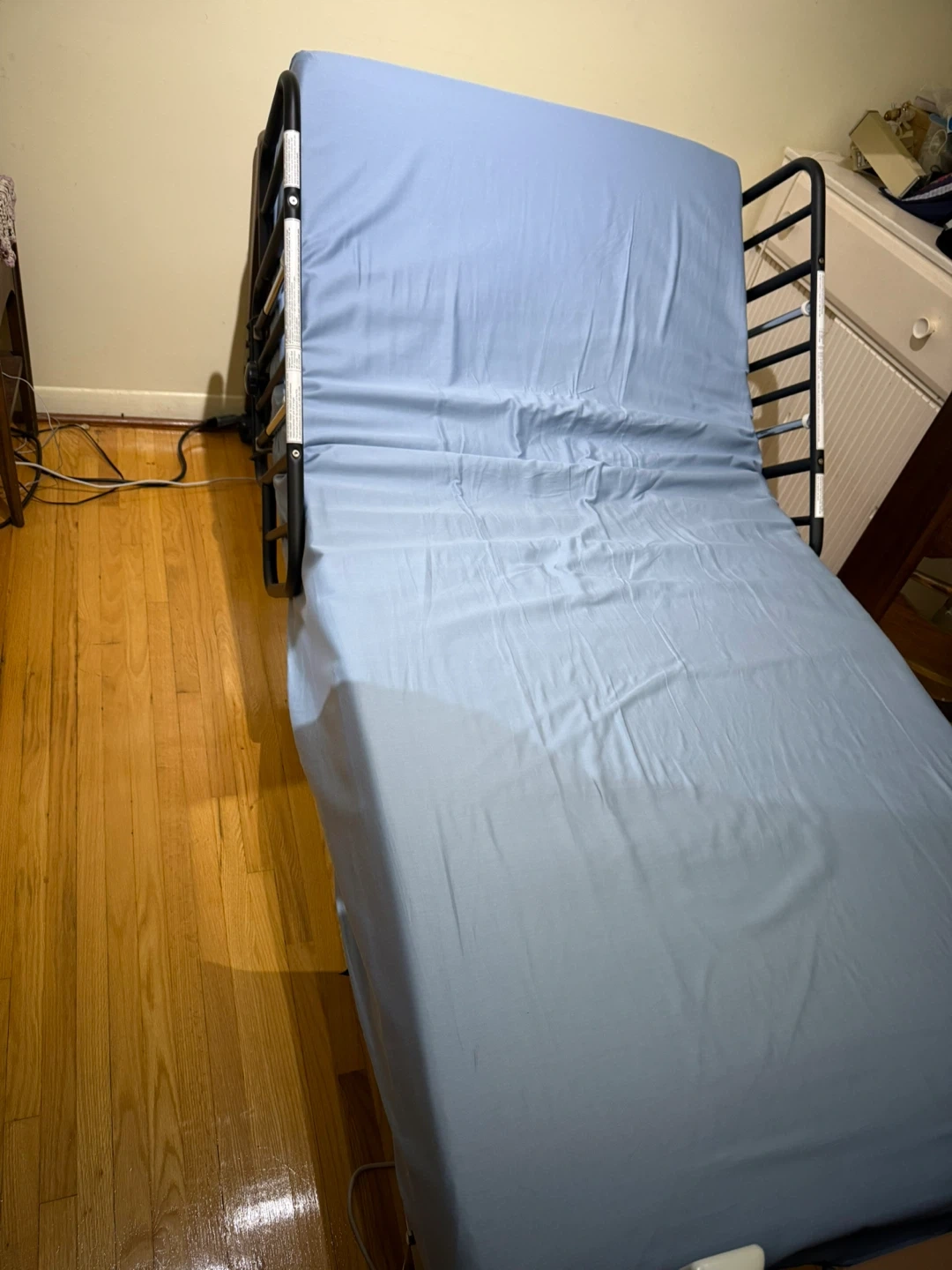 This is an adjustable hospital bed. It features a brown frame and a light blue mattress. The bed's height and position can be adjusted to suit different needs. It's equipped with side rails for safety and mobility wheels.