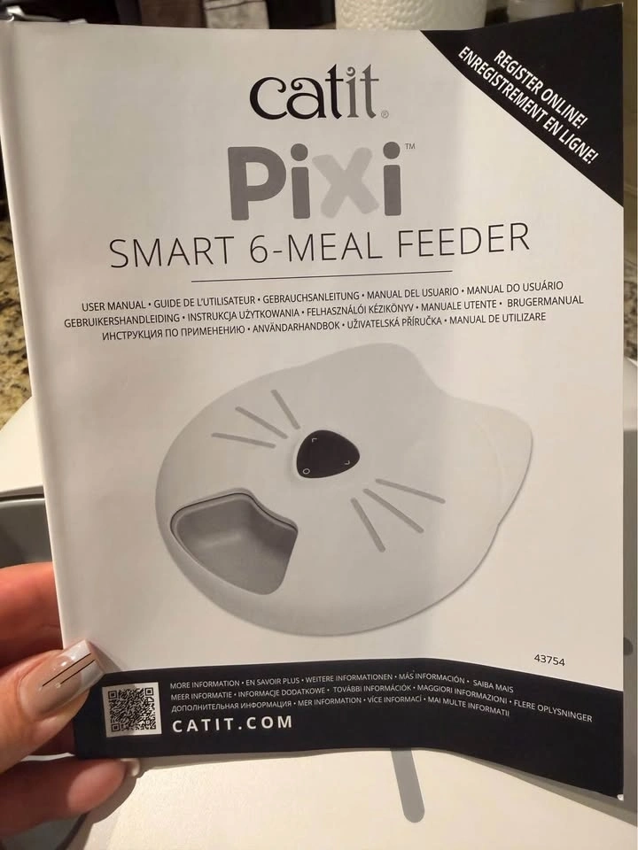 Clean Catit Pixi Smart 6-meal Feeder with 6 compartments. Includes 2 cold elements to keep wet food fresh. This automatic pet food dispenser is USB powered or can use 4x AAA batteries for backup (batteries not included). Programmed via phone app. Great for cats or small dogs. Pick up at Terwillegar.