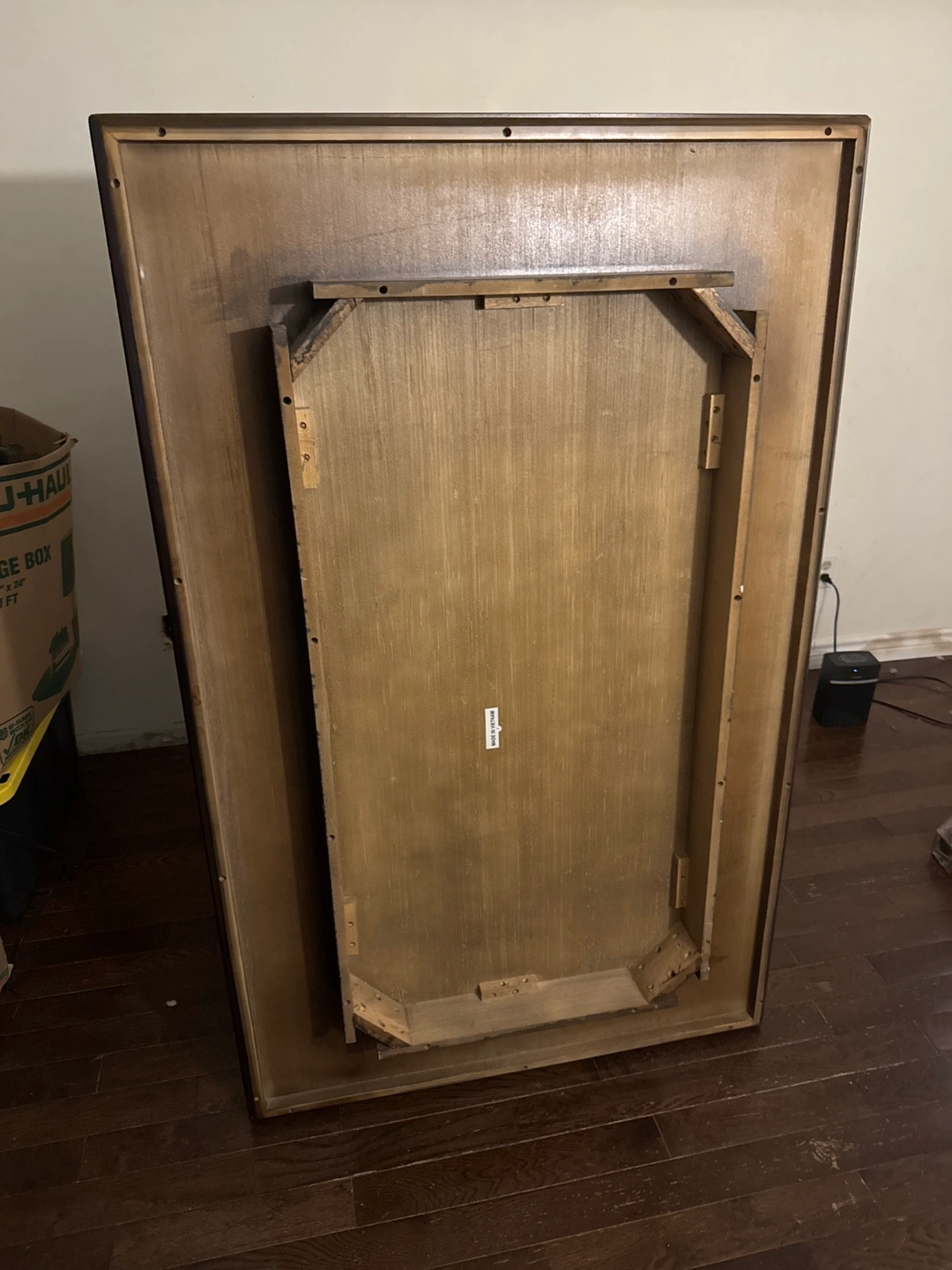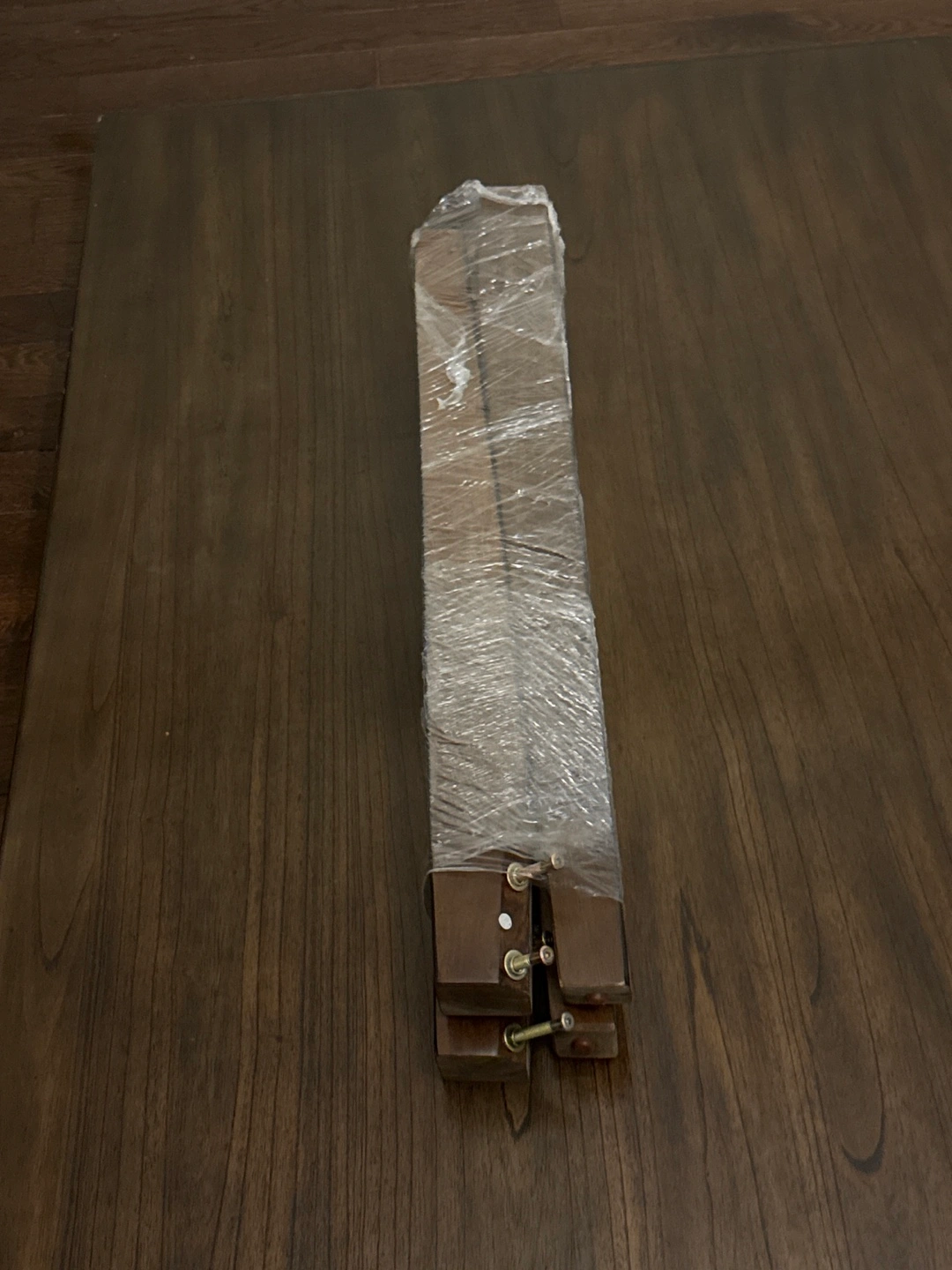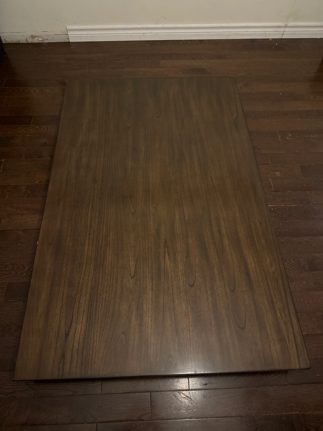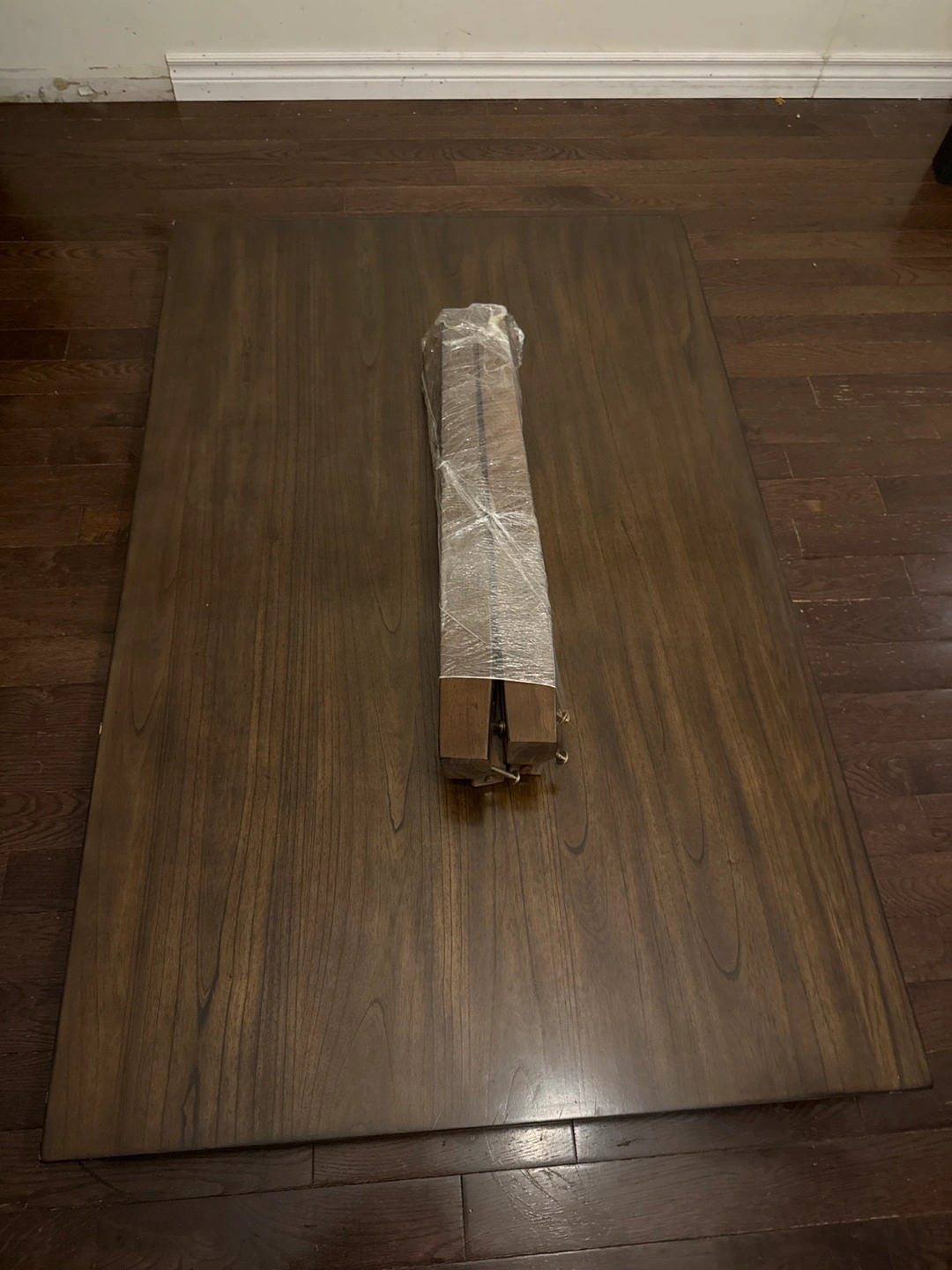 Rectangular dinner table. Dark brown wood finish. Legs are separate and wrapped in plastic. Made in Vietnam. Hand crafted very expensive