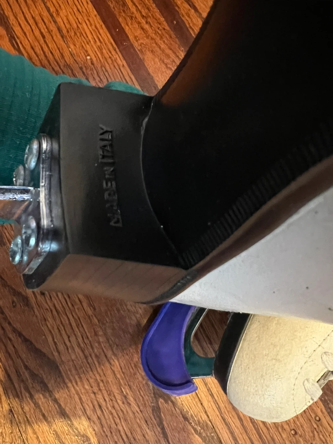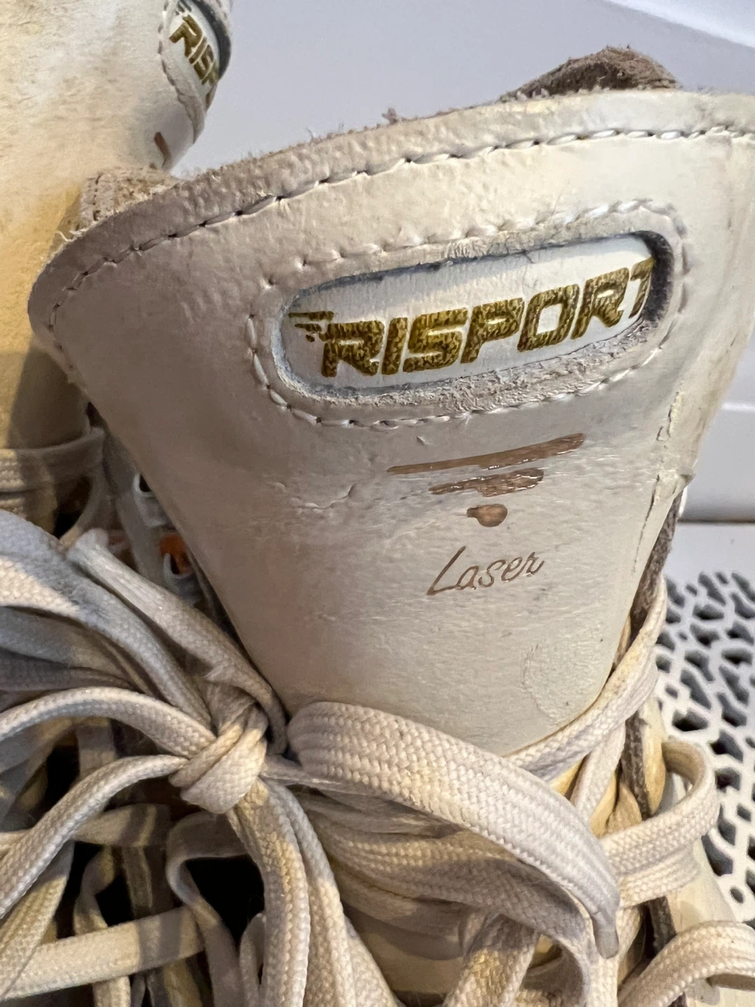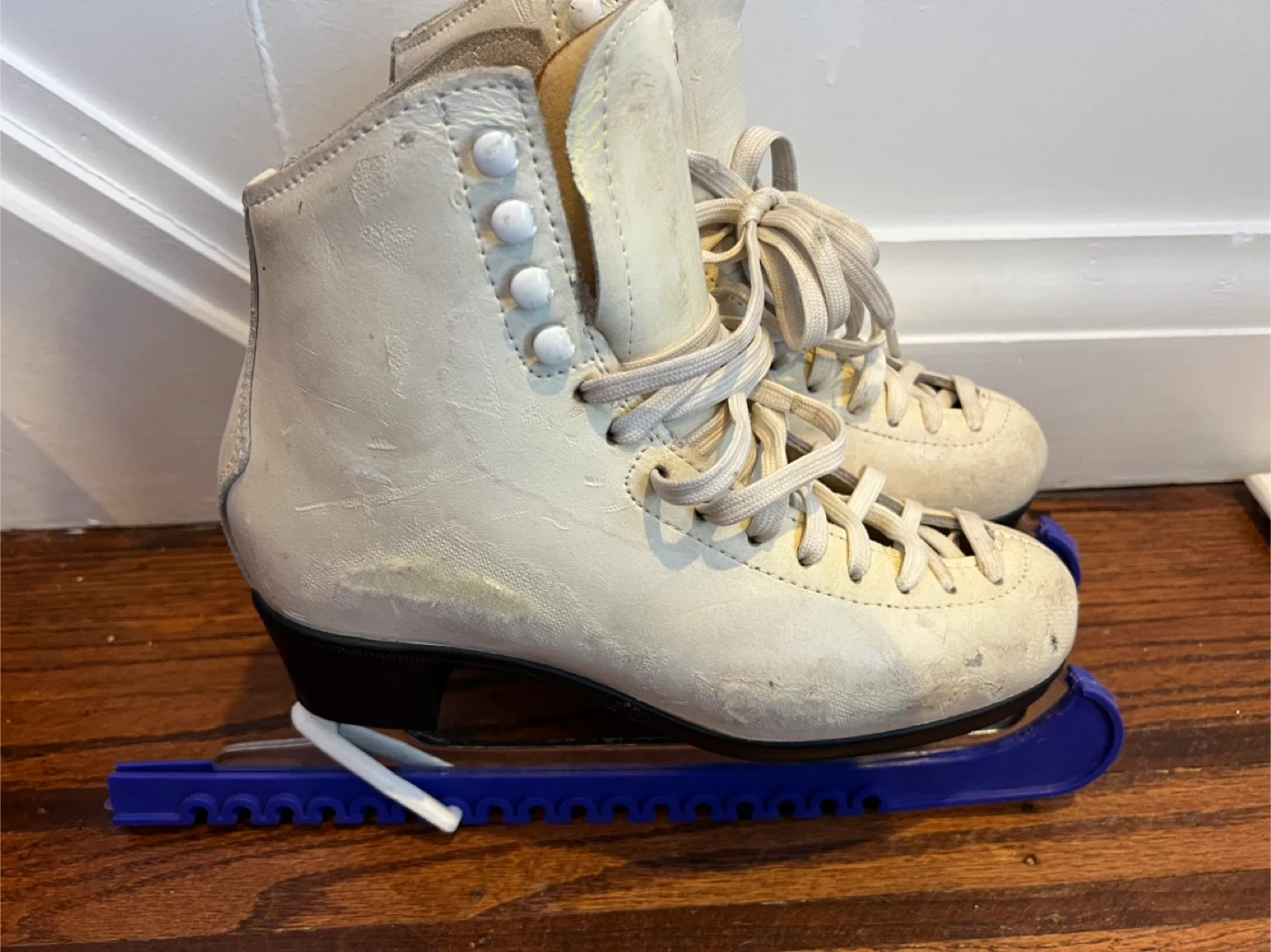Figure skates for sale, made in Italy. Well-loved on the outside, but still perfectly functional and have plenty of fun left in them.