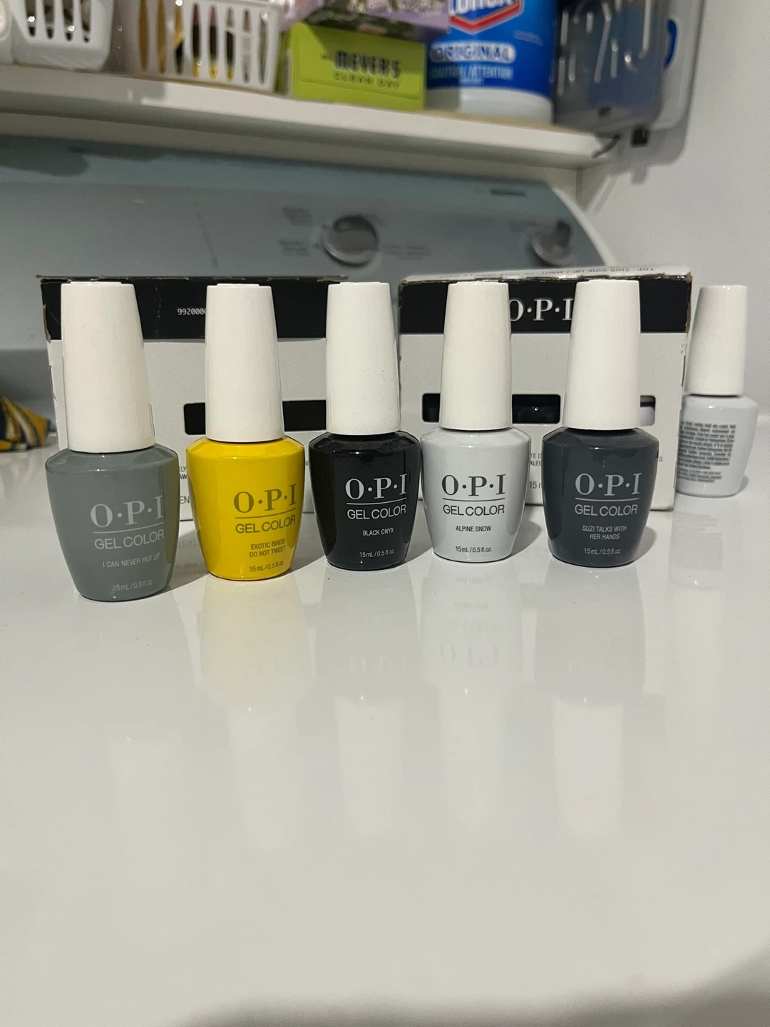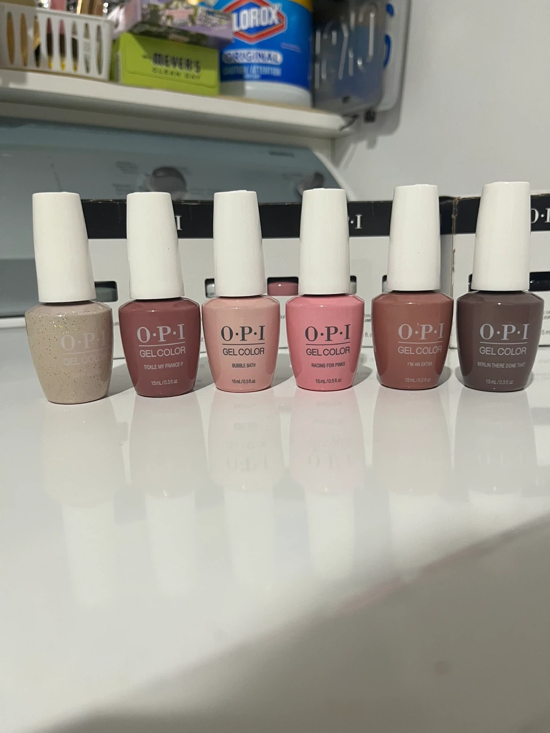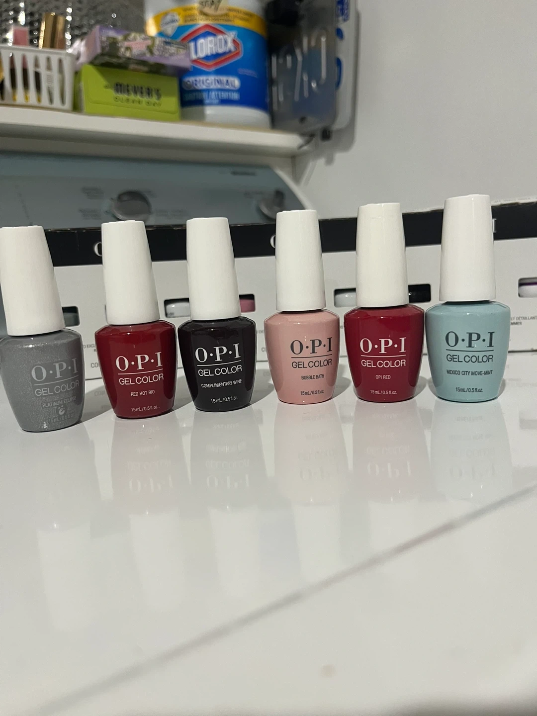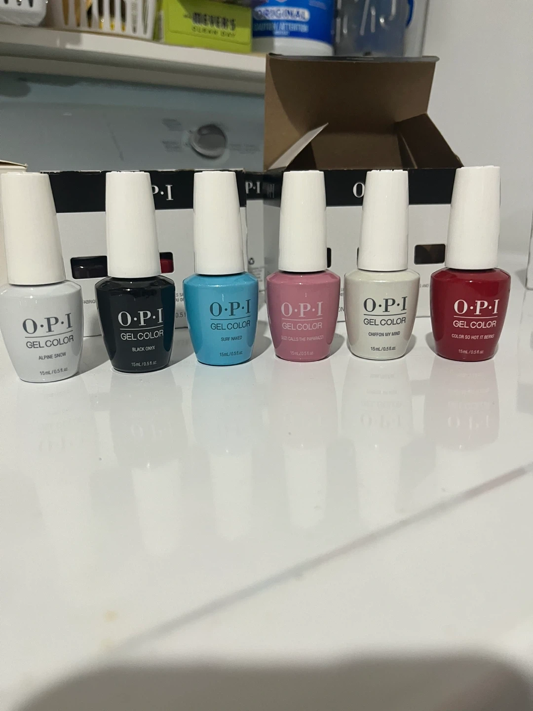 A collection of OPI GelColor nail polishes in various shades. Each bottle contains 15 ml / 0.5 fl oz. These are salon-quality gel polishes for long-lasting wear.