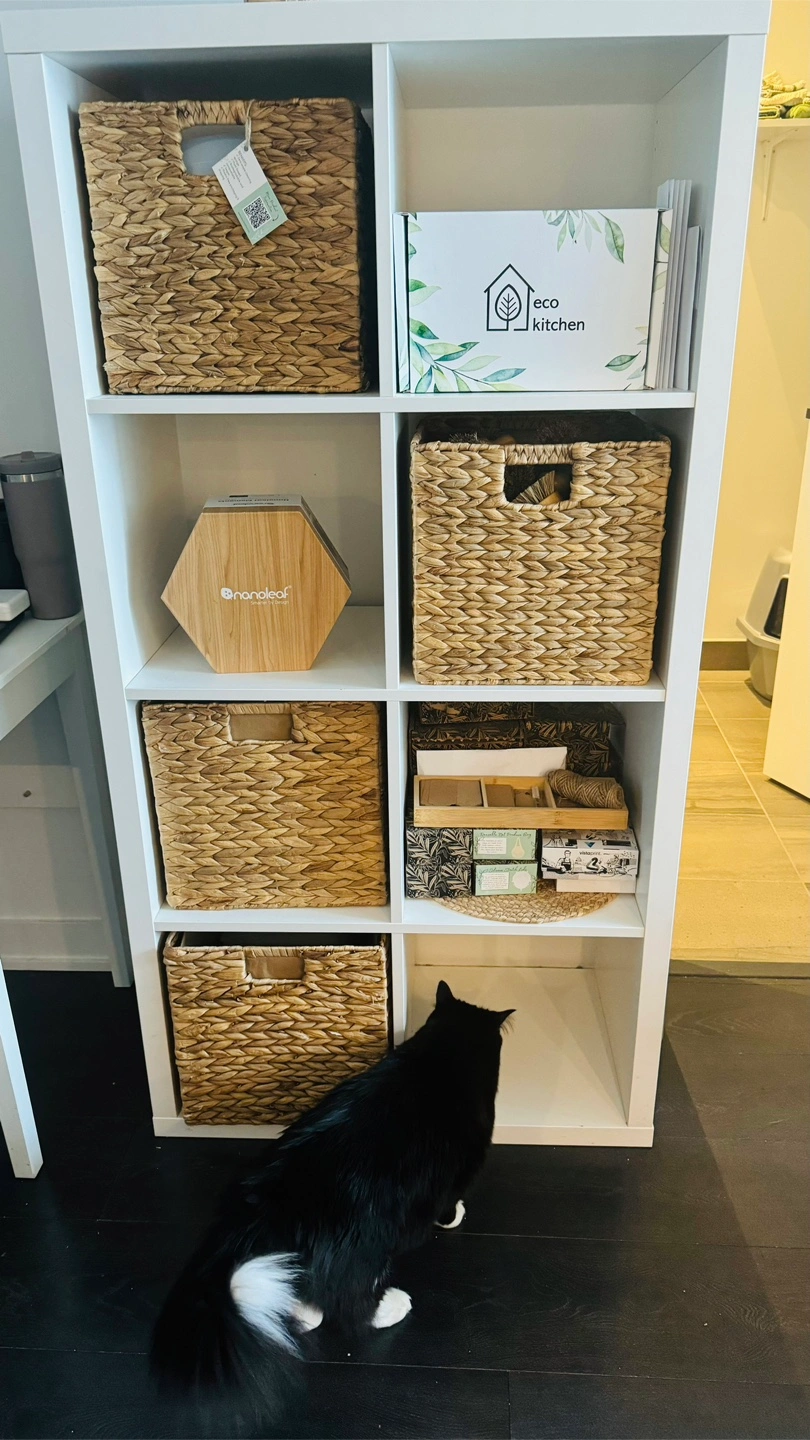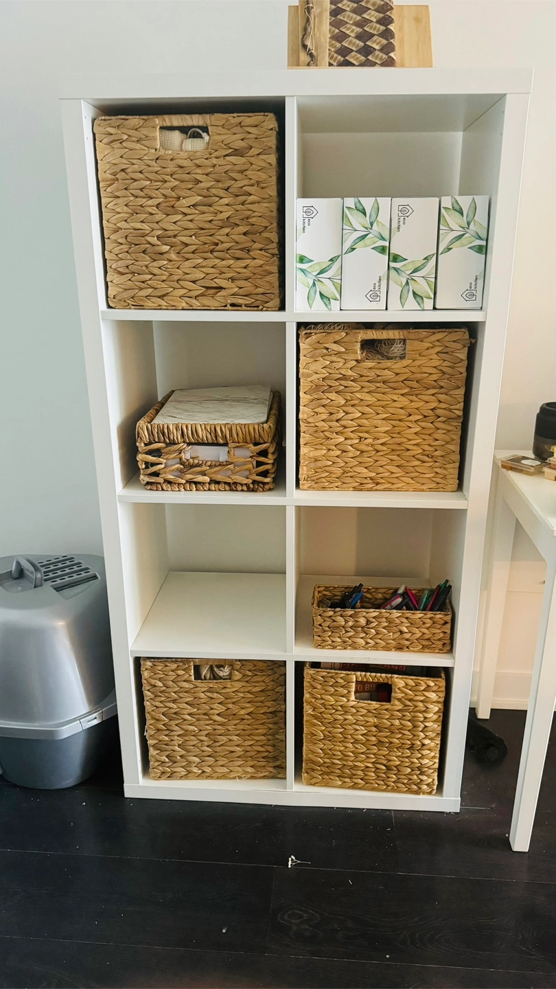 I have two white shelving units, eight cubes each. Good condition. Some minor wear. Includes optional several woven storage baskets. $50 each shelving unit + $50 for all baskets included (they were over $200 for 8)