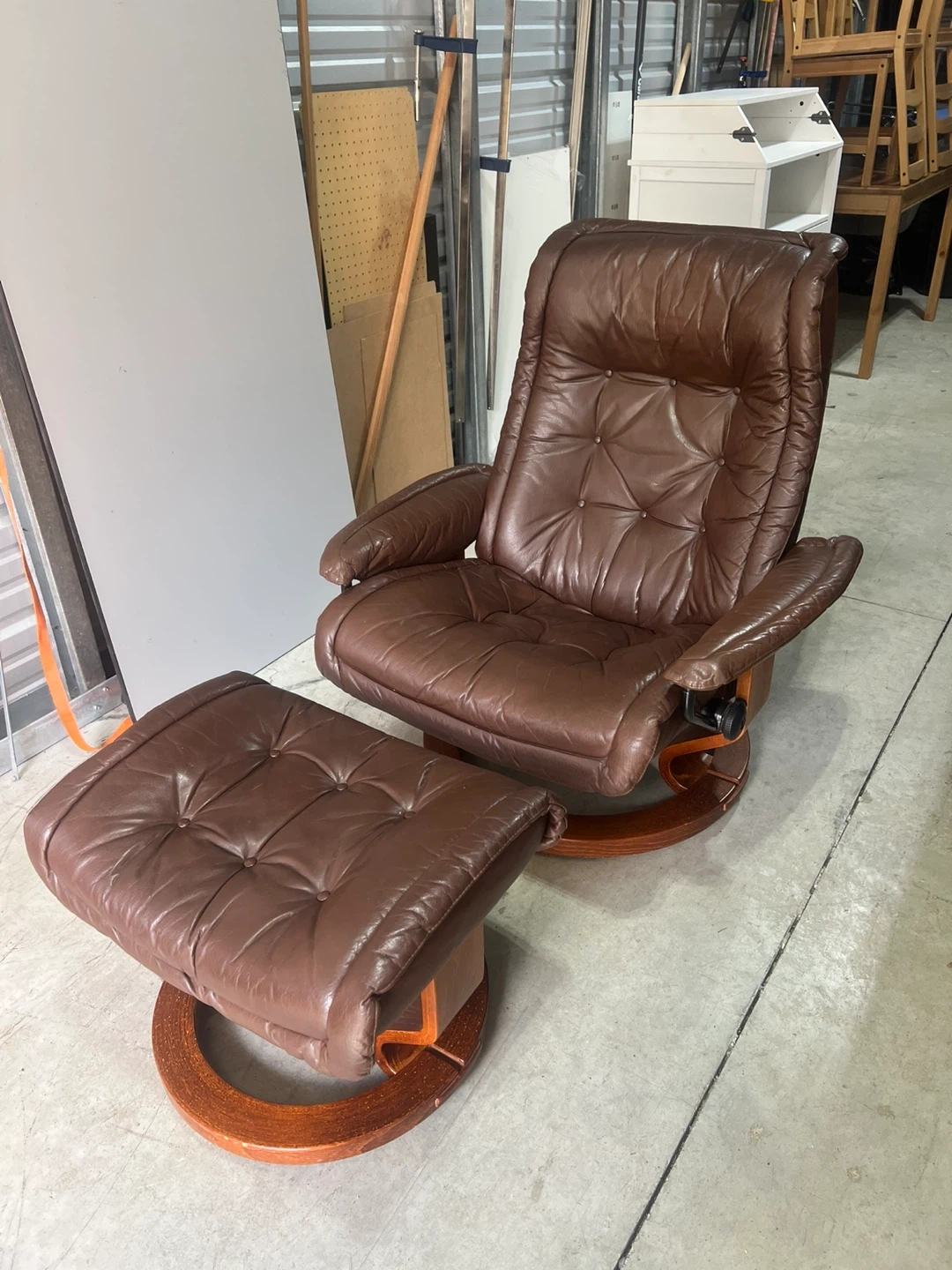 Comfortable brown leather recliner chair with a matching tufted ottoman. Features a swivel and recline function. The wooden base provides sturdy support. This set is perfect for relaxing! Large size chair