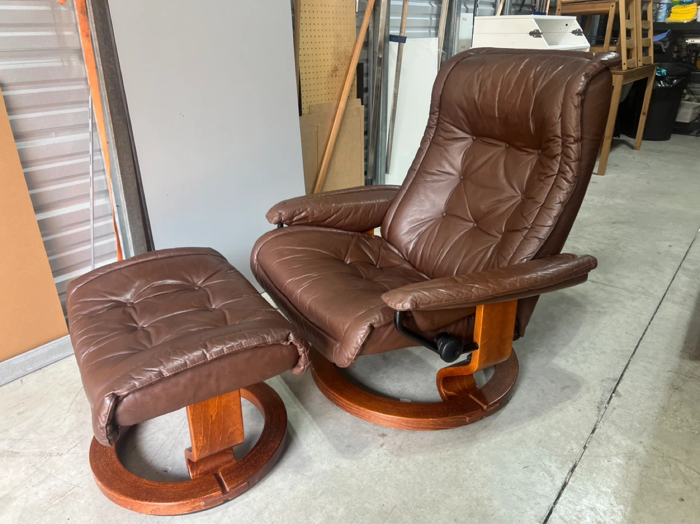 Comfortable brown leather recliner chair with a matching tufted ottoman. Features a swivel and recline function. The wooden base provides sturdy support. This set is perfect for relaxing! Large size chair