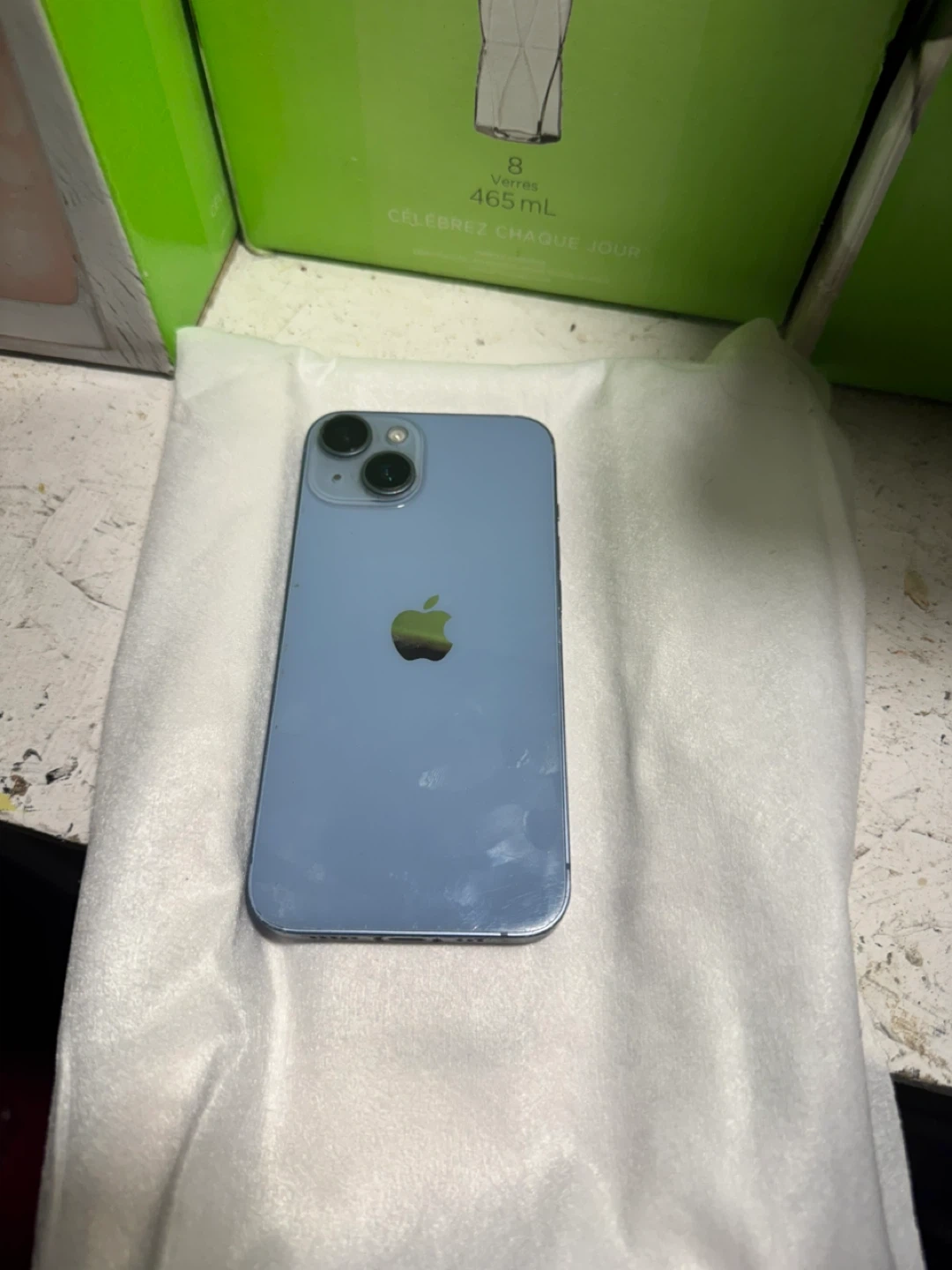 Apple iPhone 14 in blue. It's a smartphone with a 6.1-inch display and a dual-camera system. Supports 5G connectivity. Please text 226-581-2510