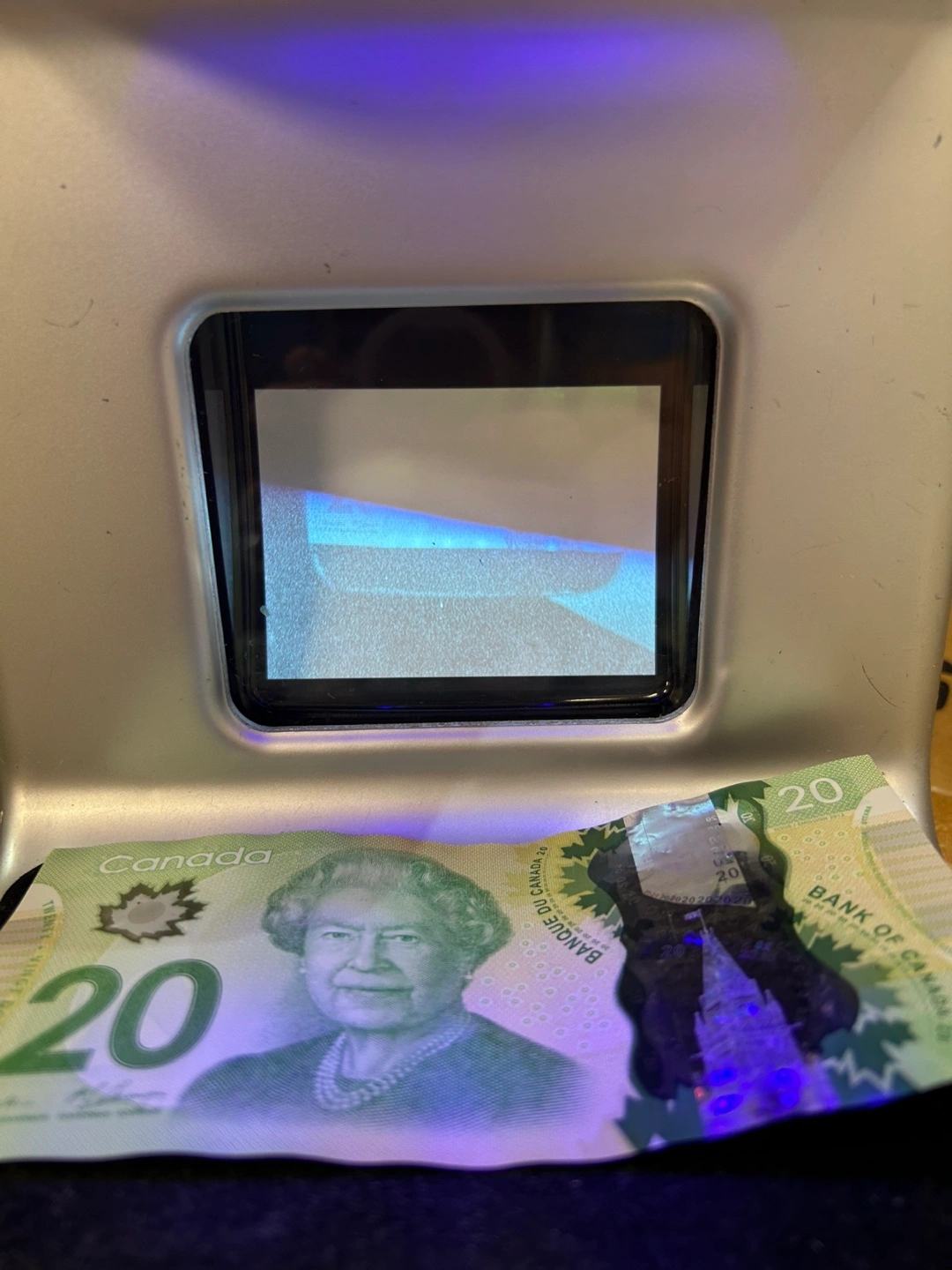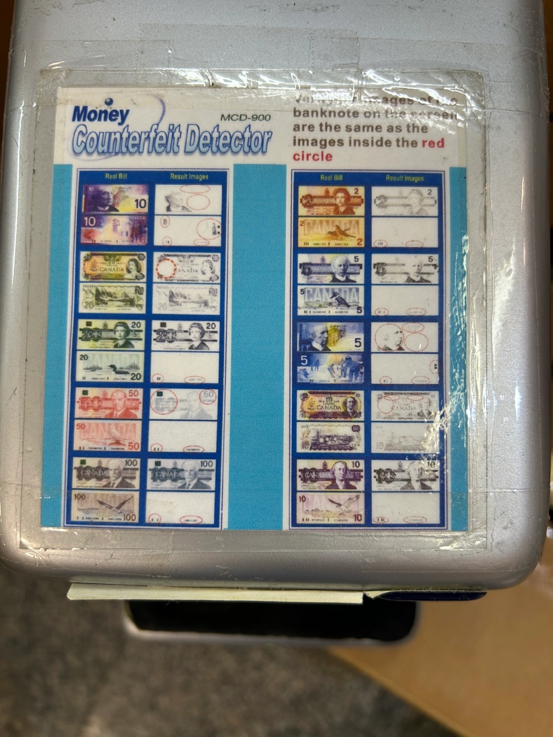 Selling a Money Counterfeit Detector MCD-900. It helps to verify images on the banknote to ensure they match the images inside the red circle. Great for ensuring you're not accepting counterfeit bills!