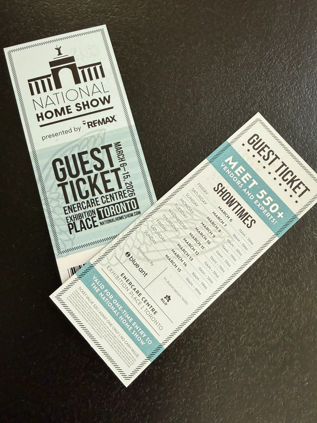 Giving away x2 guest tickets for the National Home Show held at Enercare Centre, Exhibition Place, Toronto. It's valid for one-time entry until Sunday March 16, 2026.